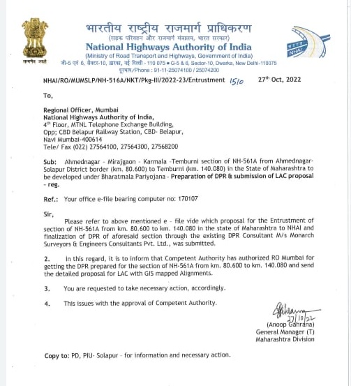 आता या पत्राप्रमाणे वर्षानुवर्षे रखडलेल्या या कामाचे प्रश्न मार्गी लागत असल्यामुळे करमाळा तालुक्यातून येथून आनंद व्यक्त होत आहे. या प्रश्ना प्रकरणी शिवसेनेचे जिल्हाप्रमुख महेश चिवटे यांनी दिल्ली येथे जाऊन रस्ते मंत्री नितिन गडकरी यांना निवेदन दिले होते. यावेळी गडकरी यांनी त्यांचे सहाय्यक बिराजदार यांनायावर कारवाई करण्याचे आदेश दिले होते. दरम्यान, गेली दोन महिन्यापासून या प्रकरणाचा पाठपुरावा केला जात होता.