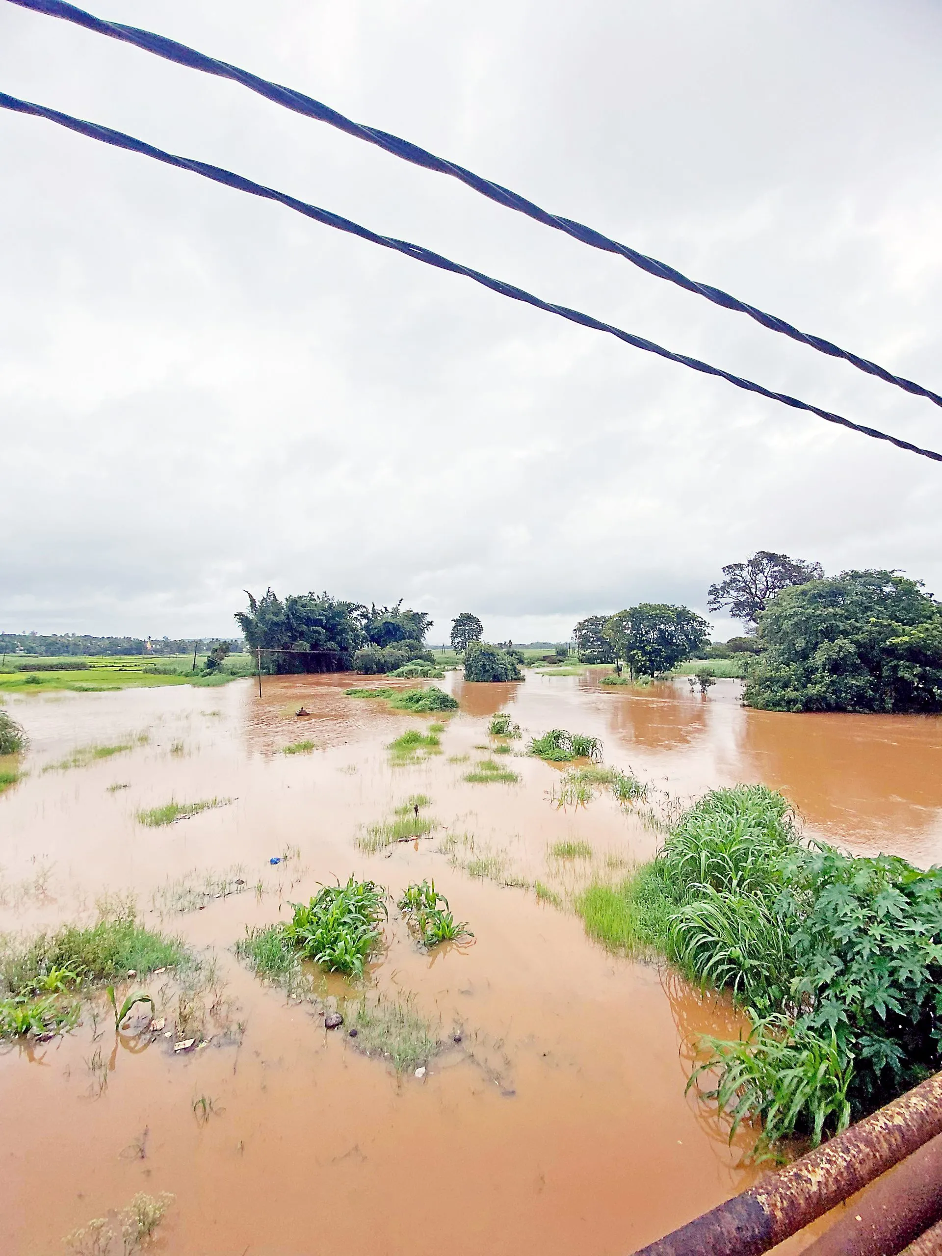 रविवारी पहाटेपासूनच संपूर्ण पश्चिम भागात मुसळधार आणि संततधार पावसाला जोर आल्याने आणि या संपूर्ण भागातील नदीच्या पात्राच्या दुतर्फा पसरलेल्या हजारो एकर पाणलोट क्षेत्रातील पाणी मार्कंडेय नदीच्या पात्रात जमा होत गेल्याने तसेच राकसकोप धरणातील जादा पाणी सोडण्यासाठी राकसकोप धरणाचे दोन दरवाजे उघडण्यात आले आहेत. परिणामी नदीच्या पात्रात पाण्याची पातळी वाढत गेल्याने या भागातील शेतवडीत पाणी शिरले आहे. नदीच्या दुतर्फा हजारो एकर जमिनीमध्ये शेतकऱ्यांनी गेल्या आठवड्यातच भाताच्या रोपांची लागवड केली आहे. सदर रोपांनी अद्याप मूळही धरलेले नाही आणि आकस्मात आलेल्या या पुरामुळे लावलेली कोवळी रोपे वाहून गेल्याने शेतकऱ्यांना दुबार भात रोप लागवडीचे संकट येऊन ठेपले आहे.