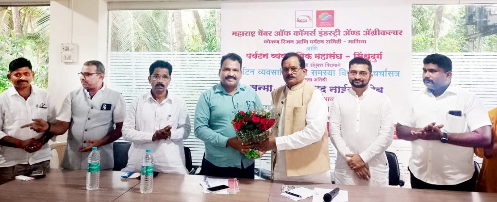 महाराष्ट्र चेंबर ऑफ कॉमर्स इंडस्ट्री ऍण्ड ऍग्रीकल्चरच्या कोकण रिजन आणि पर्यटन समिती, पर्यटन व्यावसायिक महासंघ, सिंधुदुर्ग यांच्या संयुक्त विद्यमाने मंत्री नाईक यांच्या प्रमुख उपस्थितीत पर्यटन व्यावसायिकांच्या समस्यांवर येथील हॉटेल चिवला बीच येथे चर्चासत्र आयोजित करण्यात आले होते. व्यासपिठावर पर्यटन समिती चेअरमन संतोष तावडे, पर्यटन महासंघ अध्यक्ष बाबा मोंडकर, उपाध्यक्ष चंद्रशेखर पुनाळेकर, अशोक सावंत, धोंडी चिंदरकर, लखमराजे भोसले, टीटीडीएस अध्यक्ष सदानंद साळगावकर आदी उपस्थित होते. सूत्रसंचालन महेश मांजरेकर यांनी केले. दरम्यान, बाबा मोंडकर यांची महाराष्ट्र चेंबर ऑफ कॉमर्स ऍण्ड ऍग्रीकल्चरच्या पर्यटन समिती कोकण विभाग प्रमुखपदी तसेच मेघा गावकर यांची महिला उद्योजकता समिती संचालकपदी निवड झाल्याबद्दल सत्कार करण्यात आला.