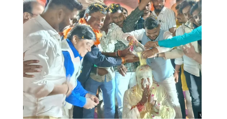 मध्यप्रदेशातील रतलाम येथे भाजप कार्यकर्त्यांनी एका उमेदवाराचा दुग्धाभिषेक केला आहे. या मतदारसंघात भाजपचा विजय निश्चित असल्याचे म्हणत अतिउत्साही कार्यकर्त्यांनी हे कृत्य केले आहे. या घटनेचा व्हिडिओ आता सोशल मीडियावर व्हायरल होत आहे. हा व्हिडिओ रतलाम येथील ग्रामीण मतदारसंघातील आहे. येथे भाजप कार्यकर्त्यांनी उमेदवार मथुरालाल डामर यांचा विजय निश्चित मानून त्यांच्यावर दुग्धाभिषेक केला आहे. कार्यकर्त्यांनी डामर यांना कुंडात बसून त्यांच्यावर दुधाचा वर्षाव केला आहे.