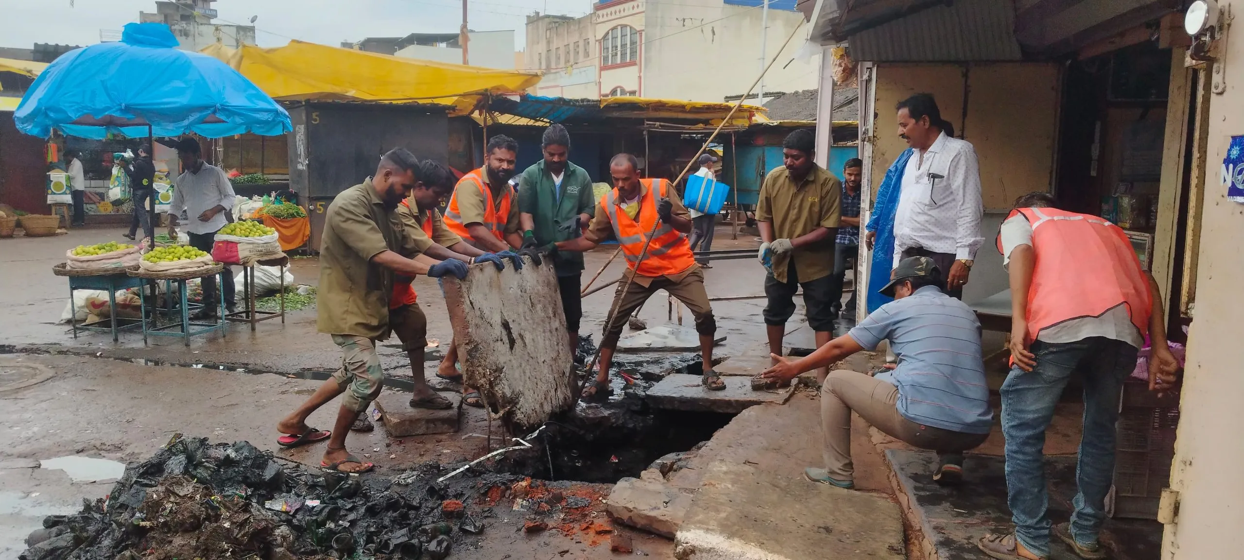 बेळगाव : शहरातील मुख्य बाजारपेठ असलेल्या कांदा मार्केटमधील गटारी तुंबल्याने सांडपाणी वाहून जाणे कठीण झाले होते. त्यामुळे मार्केटमध्येच सांडपाणी तुंबून रहात होते. सांडपाण्यातच बसून भाजी विक्रेत्यांना व्यापार करावा लागत होता. याचा फटका ग्राहकांनादेखील बसत असल्याने नगरसेवक जयतीर्थ सवदत्ती यांनी पुढाकार घेत सोमवारी बाजारपेठेतील गटारींची मनपाच्या सफाई कामगारांना सफाई करण्यास सांगितले. पावसाळ्यापूर्वी गटारी व नाल्याची सफाई करण्यात यावी, अशी सूचना मनपा अधिकाऱ्यांना वारंवार करूनदेखील त्याकडे दुर्लक्ष करण्यात आले आहे. अवकाळी पावसामुळे शहरातील नाले व गटारींच्या सफाईचा प्रश्न ऐरणीवर आला आहे. यापूर्वी झालेल्या पावसात विशेष करून कांदा मार्केटमध्ये गुडघाभर पाणी तुंबले होते. सांडपाण्यामुळे भाजी विक्रेत्यांचे मोठे नुकसान होण्यासह व्यापारी व ग्रहकांना याचा नाहक त्रास सहन करावा लागला होता. त्यामुळे याची दखल घेत नगरसेवक जयतीर्थ सवदत्ती यांनी मनपाला तातडीने गटारींची सफाई करण्याची सूचना केली होती.