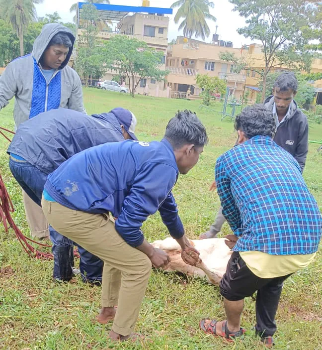 बेळगाव : महांतेशनगर येथील प्रगती गार्डनमध्ये जखमी वासरू बराच उशीर तसेच पडून होते. काही जणांनी याची माहिती महानगरपालिकेला दिली. त्यानंतर महानगरपालिकेच्या कर्मचाऱ्यांनी त्याठिकाणी जाऊन त्या जखमी वासराला वाहनातून श्रीनगर येथील गो-शाळेमध्ये आणले. त्यानंतर त्याच्यावर उपचार करण्यात आले. गेल्या काही दिवसांपासून बऱ्याच ठिकाणी बेवारस वासरे सोडून जाण्याचे प्रकार उघडकीस येत आहेत. याचबरोबर वासरे पडून जखमीही होत आहेत. गुरुवारी सायंकाळी भरपावसातच एक वासरू प्रगती गार्डनमध्ये बराच उशीर पडून होते. त्याला उठताही येत नव्हते. त्यामुळे महानगरपालिकेच्या अधिकाऱ्यांना याची माहिती देण्यात आली. महानगरपालिकेच्या कर्मचाऱ्यांनी त्या वासराला ताब्यात घेतले. राजू संकण्णावर आणि इतरांनी उपचार सुरू केले आहेत.