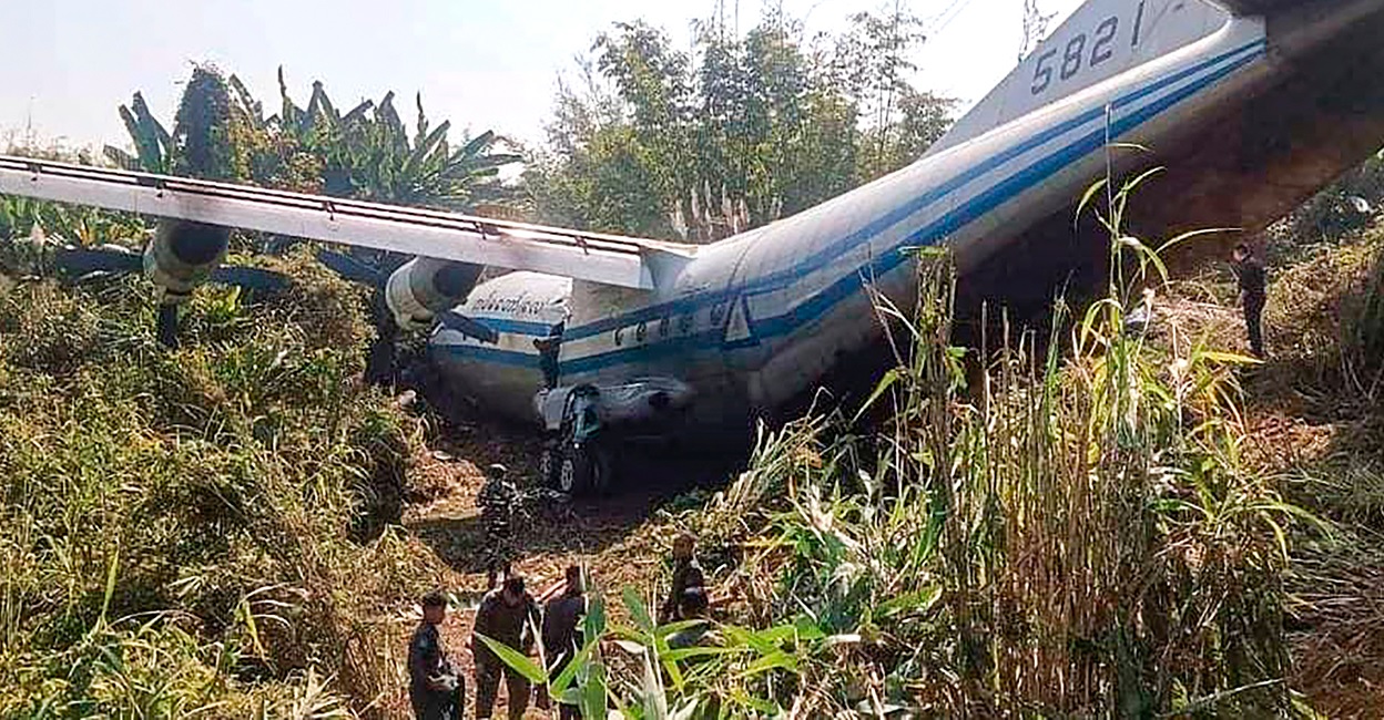 मिझोरममधून स्वत:च्या सैनिकांना परत नेण्यासाठी आलेले म्यानमारचे विमान विमानतळावर उतरताना धावपट्टीवरून घसरून दुर्घटनाग्रस्त झाले आहे. विमानात चालक दलाच्या सदस्यांसमवेत एकूण 14 जण होते. हे विमान छोट्या आकाराचे असून या दुर्घटनेत 8 जण जखमी झाले आहेत.