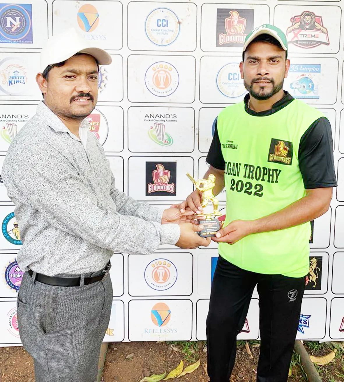 हरिषने 14 तर श्रीकांतने 13 धावा केल्या. ग्लॅडिएटर्सतर्फे सद्दाम होसकोटीने 4 धावात 3 व हुसेन गोकाकने 26 धावात 2 गडी बाद केले. सामन्यानंतर पाहुण्यांच्या हस्ते सामनावीर आदित्य कलपत्री (वॉरियर्स), सद्दाम होसकोटी (ग्लॅडिएटर) तर इम्पॅक्ट खेळाडू आर. एन. उपाध्ये व सौरभ यांना चषक देवून गौरविण्यात आले.