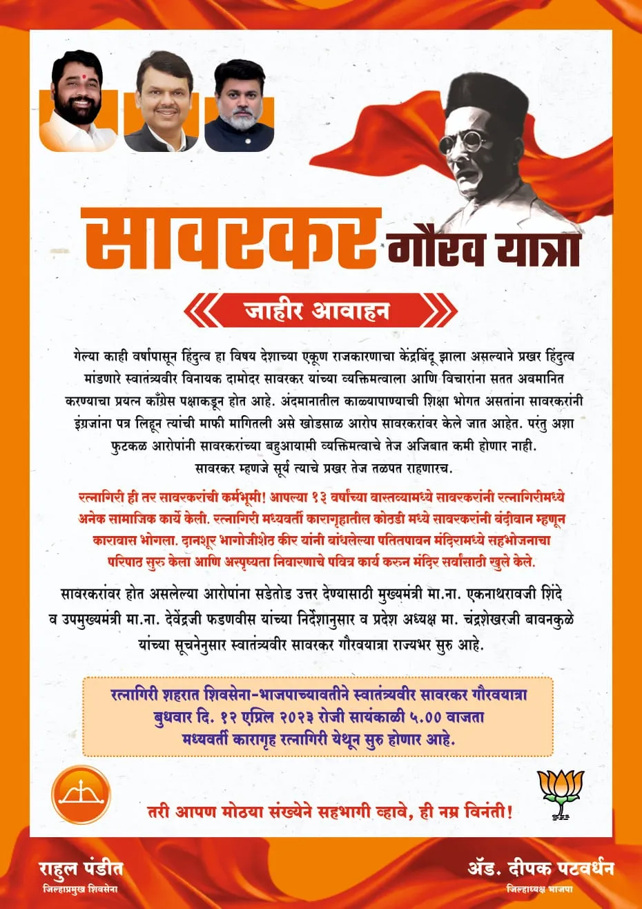 भाजपा-शिवसेनेतर्फे बुधवार दिनांक १२ एप्रिल रोजी आयोजित सावरकर गौरव यात्रेनिमित्त जे जाहीर आवाहन करण्यात आलेले आहे. त्या आवाहनातील मजकूर अर्धसत्य असून वस्तुस्थितिला धरून नाही, असा आरोप रत्नागिरी तालुका भंडारी समाज संघाचे अध्यक्ष रूपेंद्र पुंडलीक शिवलकर व कुमार वामन शेट्ये यांनी केला आहे.