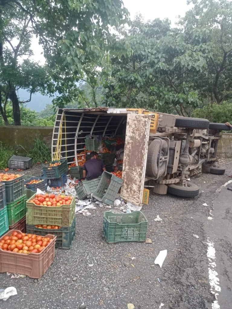 तिलारी घाटातील अपघातग्रस्त जयकर पॉईंट येथे टोमॅटो वाहतूक करणाऱ्या पिकअप गाडीला बुधवारी पहाटे अपघात झाला.या अपघाताबाबत मिळालेली माहिती अशी की बेळगावहून म्हापसा- गोवा येथे टोमॅटोची वाहतूक करत असताना बुधवारी पहाटे तिलारी घाटातील अपघातग्रस्त जयकर पॉईंट येथे पिकअप गाडी आली. गाडीवरील नियंत्रण सुटले व अपघात झाला. यात पिकअप गाडी पलटी झाली व गाडीतील प्लास्टिक ट्रे मध्ये असलेल्या टोमॅटोचे हजारों रुपयांचे नुकसान झाले आहे.अपघातात गाडी व आतील सामानाचे मोठे नुकसान झाले असून चालक व त्याचा साथीदार सुखरूप आहेत.