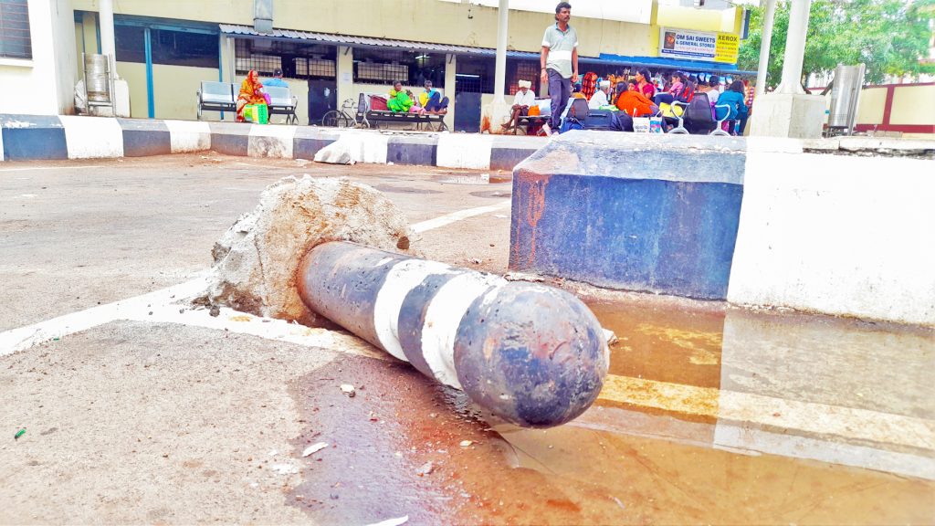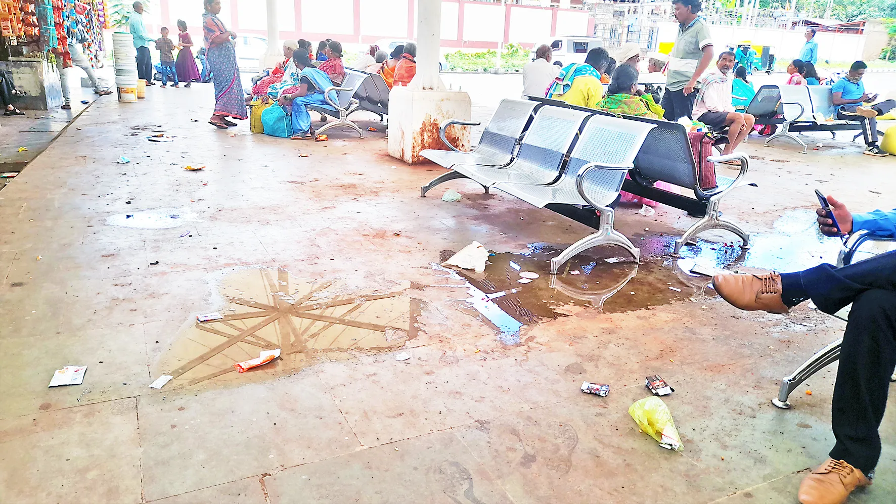 बसस्थानकाच्या आवारातील निवारा शेड आणि गाळय़ांची दुरवस्था झाल्याने स्मार्ट सिटी योजनेंतर्गत निधी खर्च करून बसस्थानकाचा विकास करण्यात आला आहे. प्रशस्त बसस्थानकाची आणि प्रवाशांसाठी आवश्यक निवारा शेडची उभारणी करण्यात आली आहे. तसेच महिला कक्ष, पोलीस चौकी, परिवहन महामंडळासाठी कार्यालय आदी उपलब्ध करण्यात आले आहे. मात्र सध्या बसस्थानकाच्या देखरेखीकडे दुर्लक्ष झाले असून बसस्थानकाची दुरवस्था झाली आहे. सदर बसस्थानक निराश्रीतांचे आश्रयस्थान बनले आहे. तसेच स्वच्छता केली जात नसल्याने दुर्गंधी पसरली आहे. बसस्थानकाचा विकास करताना सुशोभिकरण करून विविध ठिकाणी कठडय़ांची उभारणी करण्यात आली होती. मात्र या ठिकाणी येणाऱया बसच्या ठोकरीमुळे कठडय़ांची नासधूस झाली आहे.