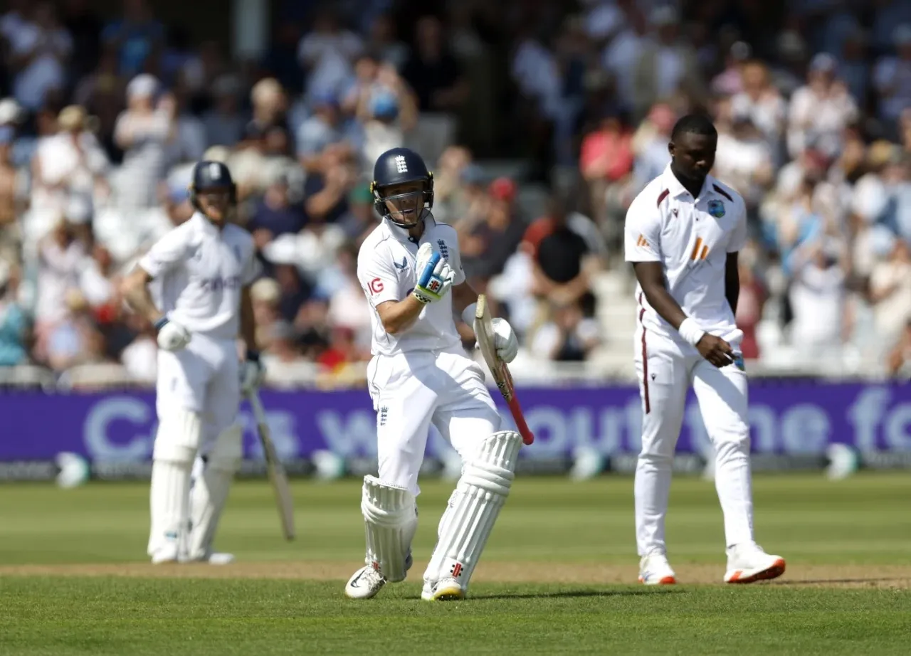 गुरूवारपासून येथे सुरू झालेल्या दुसऱ्या क्रिकेट कसोटीतील पहिल्या दिवसाच्या चहापानापर्यंत यजमान इंग्लंडने विंडीजविरुध्द 4 बाद 259 धावा जमविल्या. चहापानावेळी ओली पोप 115 धावांवर खेळत आहे. इंग्लंडच्या डकेटने अर्धशतक झळकविले. इंग्लंडने डावाला दमदार सुरूवात करताना 4.2 षटकात (26 चेंडूत) वेगवान अर्धशतक झळकविले. या मालिकेत इंग्लंडने लॉर्डस्च्या पहिल्या कसोटीत इंग्लंडने विंडीजचा डावाने पराभव करुन आघाडी मिळविली आहे. या दुसऱ्या कसोटीत विंडीजने नाणेफेक जिंकून इंग्लंडला प्रथम फलंदाजी दिली. मात्र इंग्लंडच्या डावाला चांगली सुरूवात झाली नाही. जोसेफच्या पहिल्याच षटकातील तिसऱ्या चेंडूवर सलामीचा क्रॉले खाते उघडण्यापूर्वीच झेलबाद झाला. त्यानंतर डकेट आणि पोप या जोडीने यांनी आक्रमक फटकेबाजी करत केवळ 26 चेंडूत संघाचे जलद अर्धशतक फलकावर लावले. या अर्धशतकामध्ये 10 चौकारांचा समावेश आहे. या अर्धशतकामध्ये डकेटचा 14 चेंडूत 33, तर ओली पोपचा 9 चेंडूत 16 धावांचा वाटा राहिला. या जोडीने दुसऱ्या गड्यासाठी 19 षटकांत 105 धावांची शतकी भागिदारी केली. पण उपाहारापूर्वी विंडीजने ही जोडी फोडण्यात यश मिळविले. जोसेफच्या गोलंदाजीवर होल्डरने डकेटचा झेल टिपला. डकेटने 59 चेंडूत 14 चौकारांसह 71 धावा झोडपल्या. डकेटने आपले अर्धशतक 11 चौकारांसह 32 चेंडूत पूर्ण केले. इंग्लंडचे शतक 108 चेंडूत तर डकेट आणि पोप यांनी दुसऱ्या गड्यासाठी शतकी भागिदारी 105 चेंडूत झळकविली. उपाहारावेळी इंग्लंडने 26 षटकात 2 बाद 134 धावा जमविल्या होत्या. पोप 31 धावांवर खेळत होता.