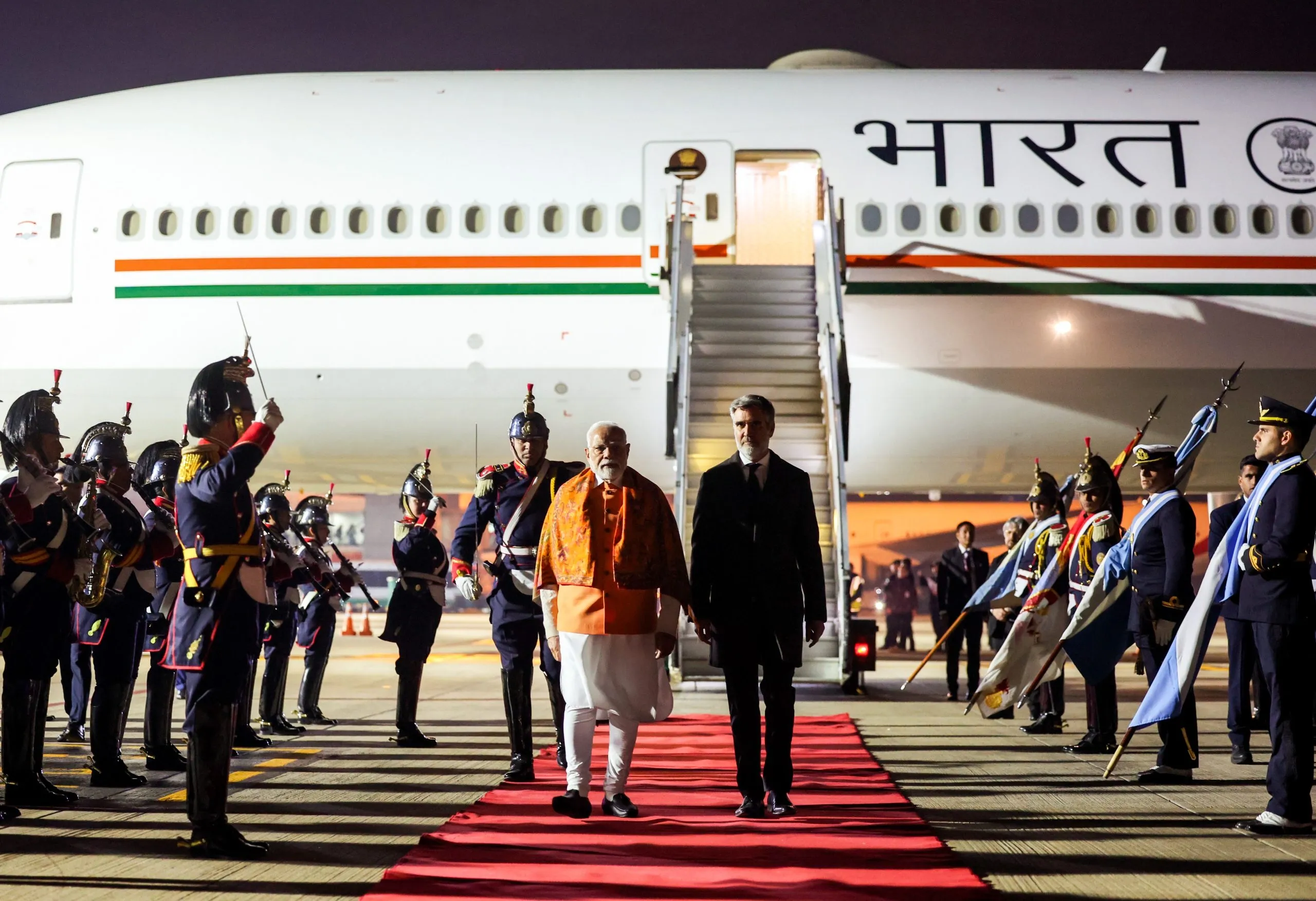 पंतप्रधान नरेंद्र मोदी यांचे अर्जेंटिनाची राजधानी ब्युनॉसआयर्स येथे भव्य स्वागत करण्यात आले आहे. ते भारतीय प्रमाणवेळेनुसार शुक्रवारी मध्यरात्री अर्जेंटिनाला पोहचले. तेथील एजिजा आंतरराष्ट्रीय विमानतळावर त्यांच्या स्वागतासाठी पारंपरिक आणि शानदार कार्यक्रमाचे आयोजन करण्यात आले होते. त्यांचा हा दौरा दोन दिवसांचा असून त्यानंतर ते ब्राझीलला ब्रिक्स परिषदेत भाग घेण्यासाठी जाणार आहेत. नंतर भारतात परतताना ते नामिबियालाही भेट देणार आहेत.