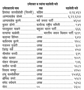 एकूण 13 लाख 93 हजार 093 मतदान झाले होते. एकूण 9600 पोस्टल बॅलेटपैकी त्यातील चक्क 2232 पोस्टल बॅलेट बाद ठरविण्यात आले. तर 7368 बॅलेट ग्राह्य धरण्यात आले. पहिल्या फेरीपासून सतत प्रियांका यांना मताधिक्य मिळत होते. केवळ 17 व्या फेरीत जोल्ले यांना 2 हजार अधिक मताधिक्य मिळाले होते. अपक्ष उमेदवार शंभू कल्लोळीकर अधिक मते घेतील ही अपेक्षा फोल ठरली. त्यांना केवळ 25466 मते मिळाली. चिकोडी लोकसभा मतदारसंघातील सर्व विधानसभा मतदारसंघातील मतदान यंत्रे चिकोडी येथील आर. डी. कॉलेजच्या स्ट्राँगरूममध्ये ठेवण्यात आली होती. सकाळी सात वाजता विविध पक्षांचे प्रतिनिधी, निवडणूक निरीक्षक, निवडणूक अधिकारी यांच्या उपस्थितीमध्ये स्ट्रॉंगरूम खोलण्यात आले. प्रारंभी पोस्टल मतमोजणी करण्यात आली. पण त्या मतमोजणीची आकडेवारी जाहीर करण्यात आली नाही. नंतरच्या टप्प्यात मतदान यंत्रातील मतमोजणी सुरू झाली.