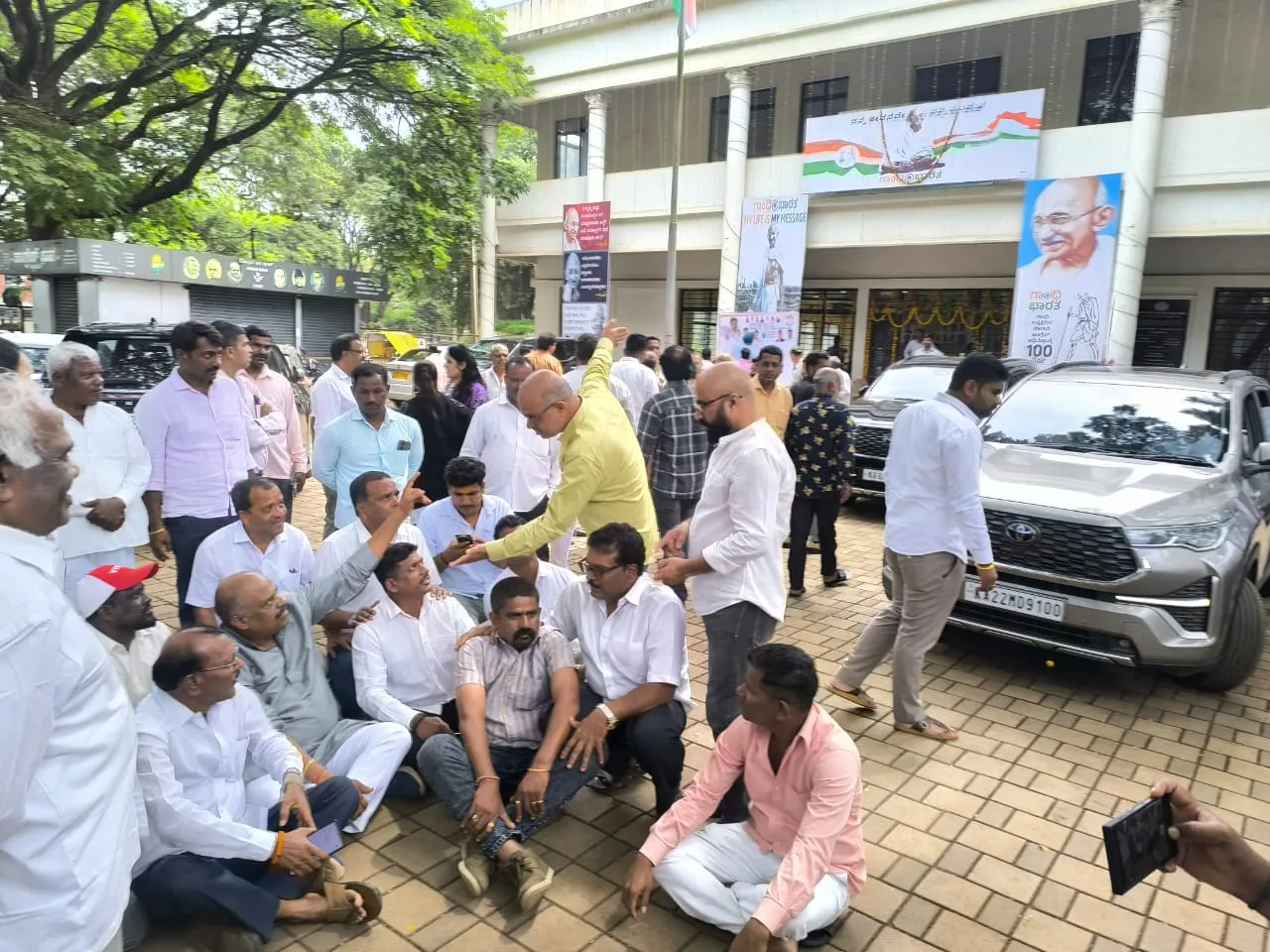बेळगाव : स्वाक्षरी संकलन मोहिमेच्या बॅनरवर महिला व बालकल्याण मंत्री लक्ष्मी हेब्बाळकर आणि आमदार चन्नराज हट्टीहोळी यांचे फोटो डावलल्याने त्यांच्या समर्थकांनी सोमवारी जिल्हा काँग्रेसचा निषेध करत काँग्रेस भवनमध्ये आंदोलन केले. यावेळी बेळगाव जिल्हा काँग्रेस अध्यक्ष विनय नावलगट्टी यांच्या विरोधातही संताप व्यक्त करत आरटीओ सर्कलनजीकच्या काँग्रेस कार्यालयासमोर निदर्शने करण्यात आली. मतदान प्रक्रियेतील गैरप्रकाराविरुद्ध बेळगावमध्ये स्वाक्षरी संकलन मोहीम आयोजित करण्यात आली आहे. स्वाक्षरी संकलन मोहिमेदरम्यान काँग्रेसचे राष्ट्रीय अध्यक्ष मल्लिकार्जुन खर्गे, मंत्री लक्ष्मी हेब्बाळकर व आमदार चन्नराज हट्टीहोळी यांचे फोटो बॅनरवर छापण्यात आले नाहीत. त्यामुळे मंत्री हेब्बाळकर यांच्या समर्थकांनी मोहिमेवर बहिष्कार टाकत निषेध केला. यावेळी समर्थकांनी काँग्रेस कार्यालयाबाहेर लावण्यात आलेला बॅनरही फाडून टाकला.