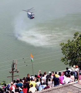 स्कायडायव्हर्सनी आकाशात तिरंगा फडकवत कार्यक्रमाला सुऊवात केल्यानंतर चिनूक हेलिकॉप्टर तलावाजवळ पोहोचल्यावर नागरिकांनी टाळ्यांच्या कडकडाटात त्याचे स्वागत केले. यानंतर हेलिकॉप्टर तिरंगा घेऊन पुढे आले. कार्यक्रमाच्या प्रारंभी व समारोपप्रसंगी राष्ट्रगीत गायले गेले. एसयू-30, मिराज 2000, जग्वार, एलसीए तेजस, हॉक्स, हेलिकॉप्टर चिनूक, एमआय-17, व्ही-5, चेतक, एएलएच आणि वाहतूक विमान सी130 आणि आयएल-78 यांनी फ्लाय पास्टमध्ये भाग घेतला. सूर्यकिरण एरोबॅटिक टीम, सारंग हेलिकॉप्टर डिस्प्ले टीम आणि आकाश गंगा टीम यांनीही कार्यक्रमात आपले कौशल्य दाखवले.