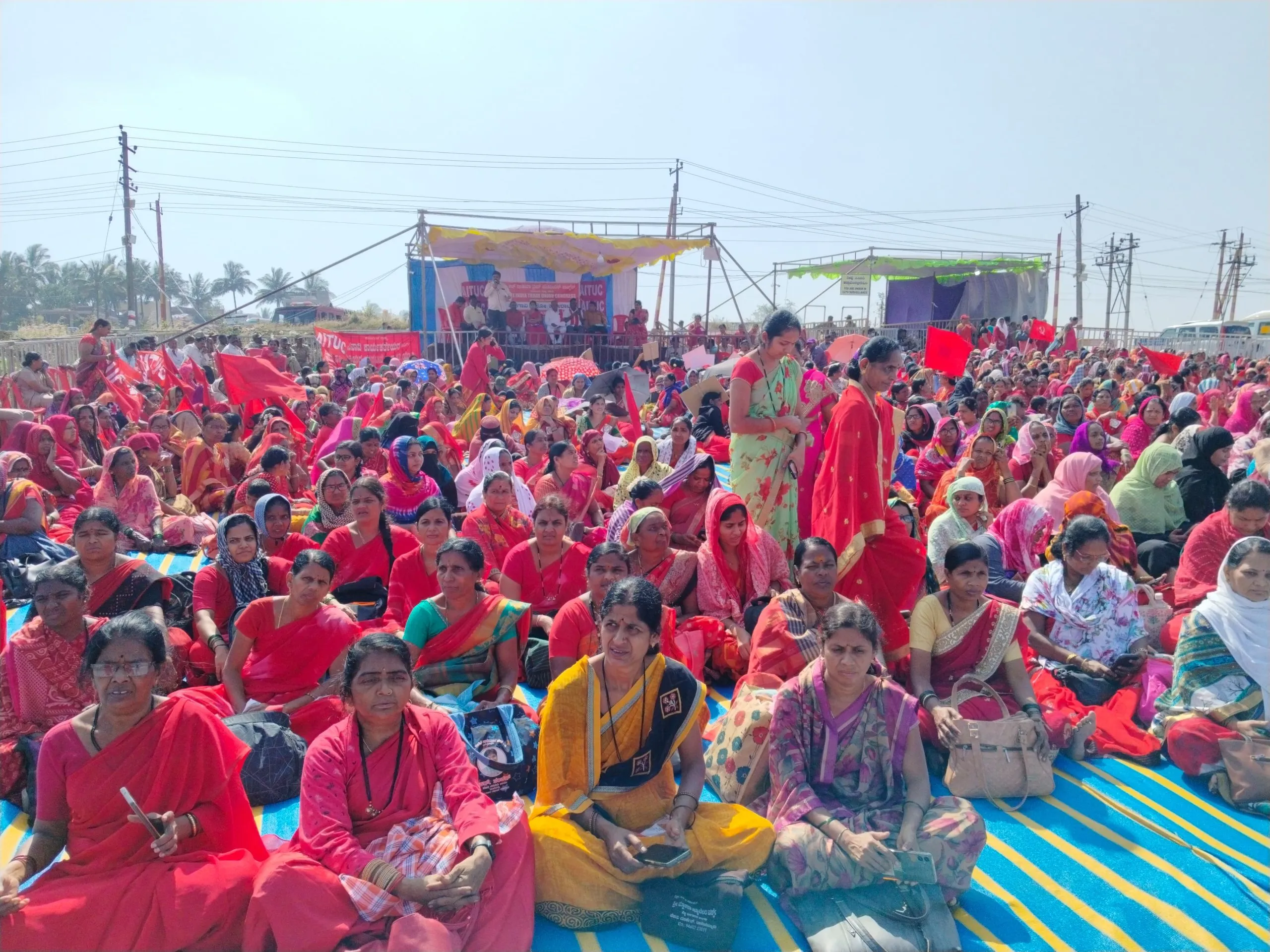 बेळगाव : बांधकाम कामगारांच्या मुलांना सोयीसुविधा पुरवा, असंघटित कामगारांना किमान वेतन व इतर शासकीय सुविधा पुरवा, अंगणवाडी साहाय्यिकांना 15 हजार तर मदतनीसांना 10 हजार रुपये मासिक वेतन द्या, अंगणवाडी कर्मचाऱ्यांना 3 लाख रुपये निवृत्ती वेतन द्या, गुजरात न्यायालयाच्या धर्तीवर राज्यातील अंगणवाडी कर्मचाऱ्यांना सुविधा पुरवा, मध्यान्ह आहार कर्मचाऱ्यांच्या वेतनात वाढ करा आदी मागण्यांसाठी ऑल इंडिया ट्रेड युनियन काँग्रेस (एआयटीयूसी) तर्फे आंदोलन छेडून सरकारविरोधात निदर्शने करण्यात आली.