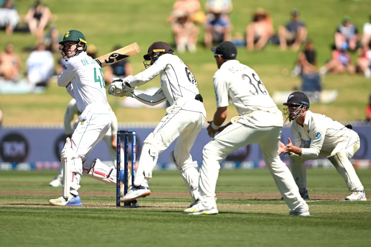 संक्षिप्त धावफलक : दक्षिण आफ्रिका प. डाव 89 षटकात 6 बाद 220 (ब्रँड 25, फॉर्च्युइन 0, व्हॅन टोंडेर 32, हमजा 20, बेडिंगहॅम 39, पिटरसन 2, स्वेर्ट खेळत आहे 55, व्हॉनबर्ग खेळत आहे 34, अवांतर 13, रचिन रवींद्र 3-33, हेन्री 1-44, ओरुरकी 1-47, वेग्नर 1-32).
