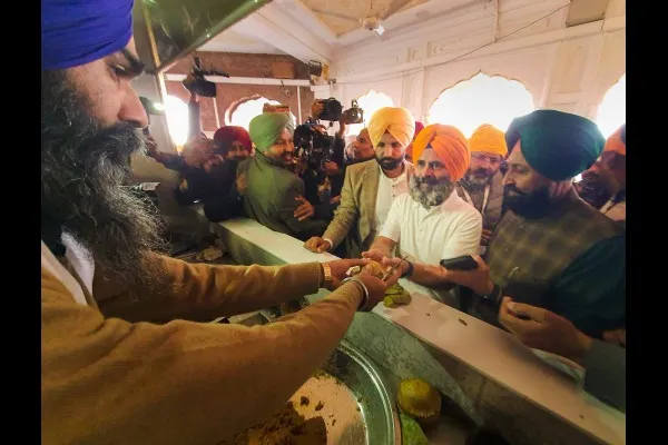 काँग्रेस खासदार राहुल गांधी यांची भारत जोडो यात्रा मंगळवारी पंजाबमध्ये पोहोचली आहे. हरियाणाच्या अंबाला येथून अमृतसर येथे पोहोचून राहुल गांधी यांनी सुवर्णमंदिरात प्रार्थना केली आहे. पगडी परिधान पेलेल्या राहुल गांधींसोबत यावेळी पंजाबमधील विरोधी पक्षनेते प्रताप सिंह बाजवा यांच्यासह अनेक वरिष्ठ नेते उपस्थित होते.
