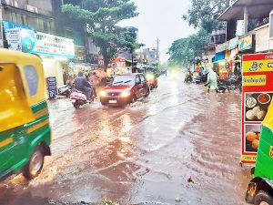 शनिवारी काहीसा उसंत घेतलेला पाऊस रविवारी सकाळपासून जोरदार बरसला. दिवसभर पावसाची संततधार सुरूच होती. पावसाचे प्रमाण वाढल्याने शहरातील सखल भागात पाणी शिरू लागले. गटारीही तुडुंब भरून वाहात असल्याने सांडपाणी रस्त्यावरून वाहात होते. विकेंड असतानाही विजेचा लपंडाव सुरू असल्याने नागरिकांनी नाराजी व्यक्त केली.