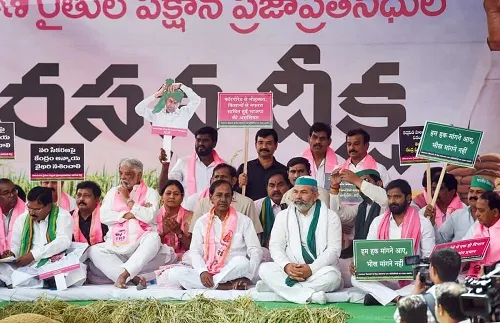 केंद्राच्या धान खरेदीचा विरोध करण्यासाठी तेलंगणाच्या नेत्यांनी निदर्शने केली. या निदर्शनात सहभागी होताना ते म्हणाले की देशात आणखी एक निषेध करण्याची गरज आहे. शेतकऱ्यांच्या प्रश्नांसाठी लढणाऱ्या प्रत्येक मुख्यमंत्र्यांना शेतकरी संघटना संयुक्त किसान मोर्चा पाठबळ देईल असेही टिकैत यांनी सांगितले. या कार्यक्रमाला संबोधित करताना भारतीय किसान युनियनचे राकेश टिकैत म्हणाले की, “देशात आणखी एका आंदोलनाची गरज आहे. आजचे निदर्शन हे राजकीय व्यासपीठ नाही. तेलंगणा मुख्यमंत्री केसीआर हे स्वत: शेतकरी आहेत; ते मतांचे राजकारण करत नाहीत. ते एक शेतकऱ्यांच्या प्रश्नांसाठी लढणारे मुख्यमंत्री आहेत, त्यामुळे संयुक्त किसान मोर्चा त्यांच्यासोबत असेल.”