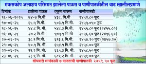 बेळगाव शहराला पाणीपुरवठा करणाऱ्या राकसकोप जलाशय पाणलोट क्षेत्रात सोमवारी दिवसभर दमदार पाऊस झाला. दिवसभर झालेल्या पावसामुळे पाणी पातळीतील सकाळच्या साठ्यात सायंकाळी अर्धा फुटाने वाढ झाली. सोमवारी सकाळी 23.9 मि.मी. पावसाची नोंद झाली तर यावर्षी आतापर्यंत एकूण 689.2 मि. मी. पावसाची नोंद झाली. जलाशयाची पाणीपातळी 2459 फूट इतकी झाली. यामध्ये अर्धाफुटाने वाढ झाल्याने एकूण पाणीपातळी 2459.50 फुटावर गेली आहे. दि. 16 जून रोजीच्या 2452.80 फूट पाणीपातळीत 8 दिवसांत 7 फुटाने वाढ झाली आहे. जलाशय पूर्ण क्षमतेने भरण्यासाठी आता 15.5 फूट पाण्याची आवश्यकता आहे. जलाशयातील एकूण पाणीसाठा 13.50 फूट इतका शिल्लक आहे. मागीलवर्षी पाणीपातळी ही 2451.45 फुटावर तर एकूण पाऊस 323 मि.मी. इतका झाला होता. जलाशयाला मिळणाऱ्या मार्कंडेय नदीपात्र आणि जांभूळ ओहळ नाल्यातून पाण्याचा प्रवाह वाढला आहे.