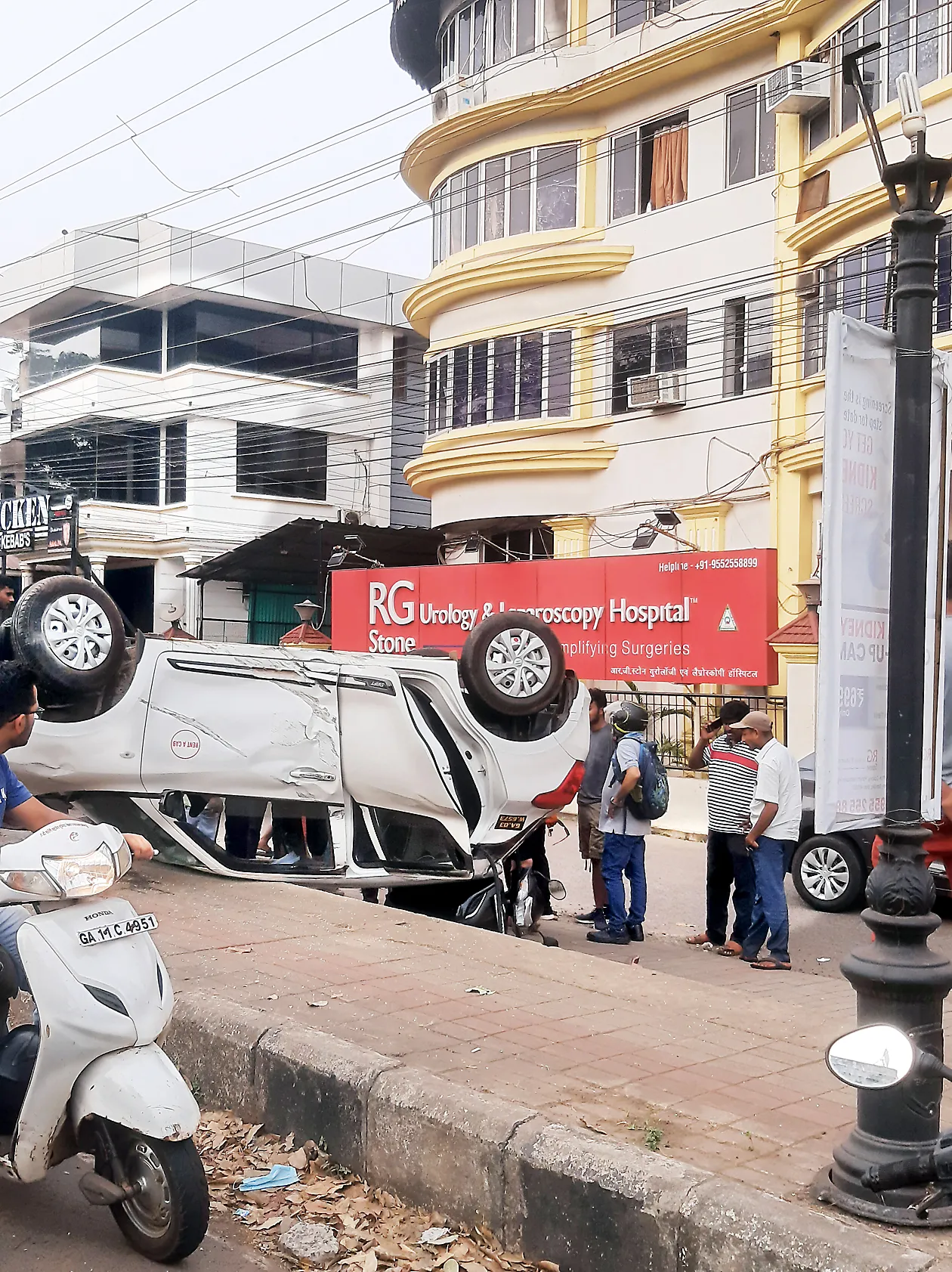 पोलिसांकडून मिळालेल्या माहितीनुसार, रेंट अ कारमध्ये एक राजस्थानी जोडपे होते. चालक नशेत असल्याने वाहनावरचा त्याचा ताबा सुटला व त्याने सरळ विजेच्या खांबाला ठोकली. त्यात ती कार फुटपाथवर उलटली. त्यामुळे हॉस्पिटल समोर पार्क करून ठेवलेल्या स्कूटर त्यात चिरडल्या गेल्या. कारमधील जोडप्याला किरकोळ दुखापत झाली. पर्वरी पोलिसांनी पंचनामा केला असून पुढील तपास करीत आहे.