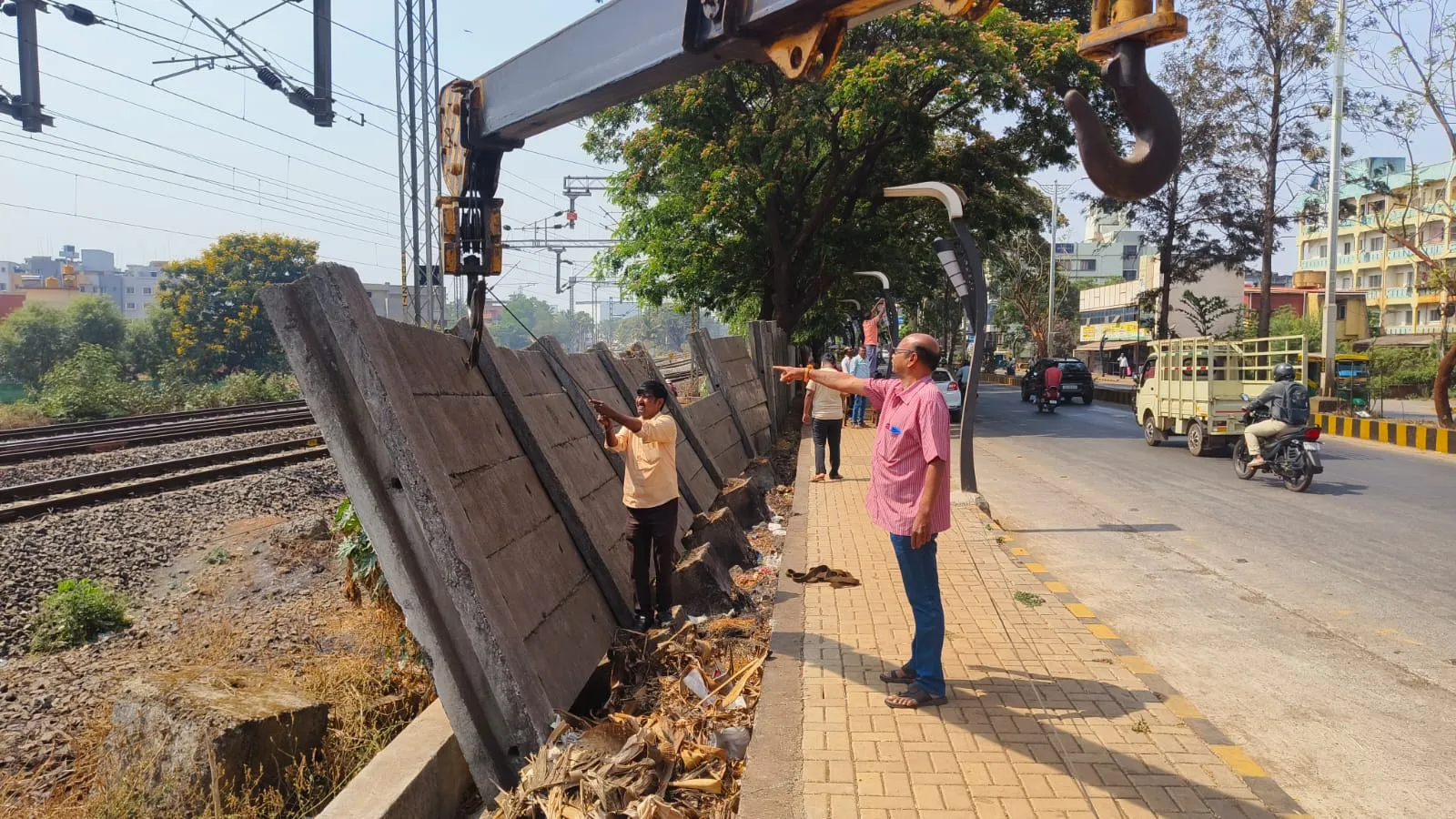 काही दिवसांनी यातील भिंती जोराच्या पावसामुळे कोसळल्या. दोन वर्षांपूर्वी काँग्रेस रोड परिसरात पावसाचे पाणी साचले होते. त्यावेळी माती खचल्याने भिंती एका बाजूला कलंडल्या होत्या. भिंत कोसळलेल्या ठिकाणाहून जनावरे, तसेच नागरिकांची ये-जा सुरू होती. सध्या रेल्वेमार्गाचे विद्युतीकरण झाले असल्याने वेगाने रेल्वे धावत आहेत. कोणताही धोका होऊ नये, यासाठी भिंतीची दुरुस्ती करण्याची मागणी करण्यात येत होती. रेल्वे सल्लागार समितीचे सदस्य प्रसाद कुलकर्णी यांनी रेल्वेच्या अधिकाऱ्यांना ही बाब सांगितल्यानंतर सोमवारपासून दुरुस्तीच्या कामाला सुरुवात करण्यात आली आहे.