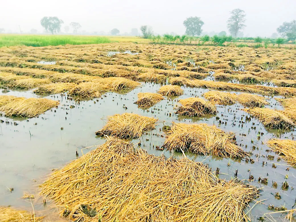 बुधवार व गुरुवारी सदर परिसरात जोरदार पाऊस झाल्याने सुकलेल्या शेतामध्ये पाणी साचले आहे. सदर बासमती भाताचीच कापणी झाली असून सलग दोन दिवस जोरदार पाऊस झाल्याने शेतामध्ये पाणीच पाणी झाले आहे. त्यामुळे शेतकऱ्यांचे मोठे नुकसान झाले आहे. संबंधित अधिकाऱ्यांनी पाहणी करून नुकसानग्रस्त शेतकऱ्यांना नुकसान भरपाई द्यावी, अशी शेतकऱ्यांनी मागणी केली आहे.
