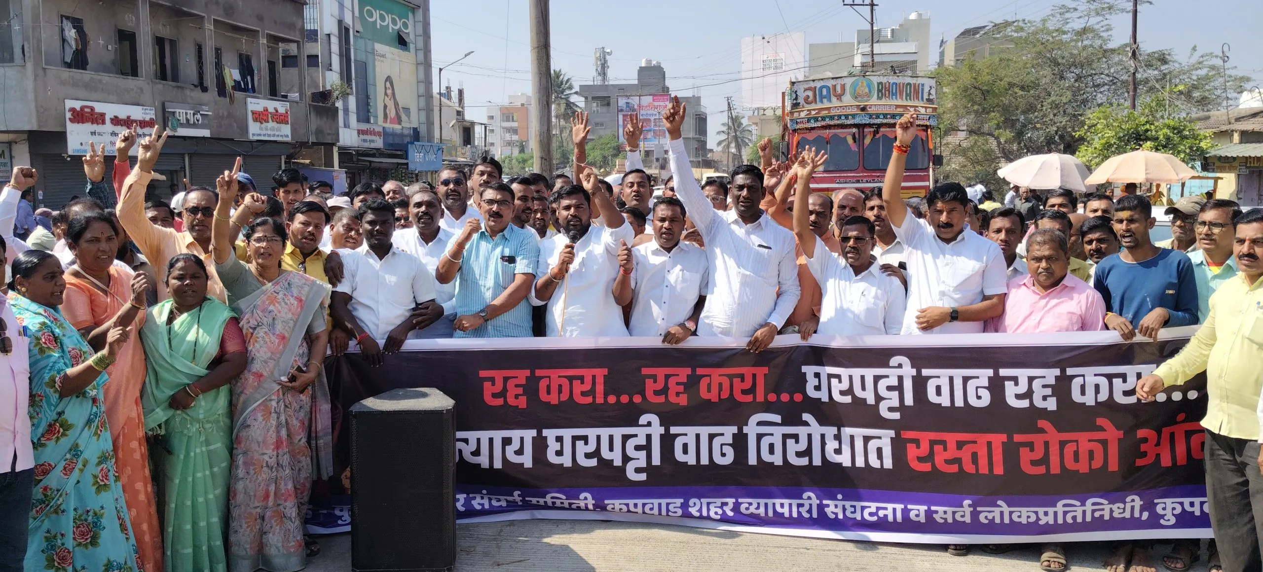 महापालिकेने खाजगी यंत्रणेमार्फत सर्व्हे करून कुपवाड परिसरातील नागरिक व व्यावसायिकांच्या मालमत्तेवर लादलेल्या जुलमी व अन्यायी घरपट्टी करवाढीचा निर्णय तात्काळ रद्द करावा. कुपवाडकारांना दिलेल्या नोटीसा मागे घ्याव्यात या मागणीसाठी सोमवारी सर्वपक्षीय नेते, संघर्ष समिती व व्यापारी संघटनेच्यावतीने कुपवाड बंद ठेवून रास्तारोको आंदोलन छेडण्यात आले. या आंदोलनात माजी नगरसेवकांनी सहभाग घेत वाढीव घरपट्टी विरोधात आक्रमक भूमिका घेतली. यावेळी मनपा प्रशासना विरोधात तीव्र शब्दात निदर्शनेही करण्यात आली.