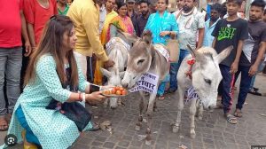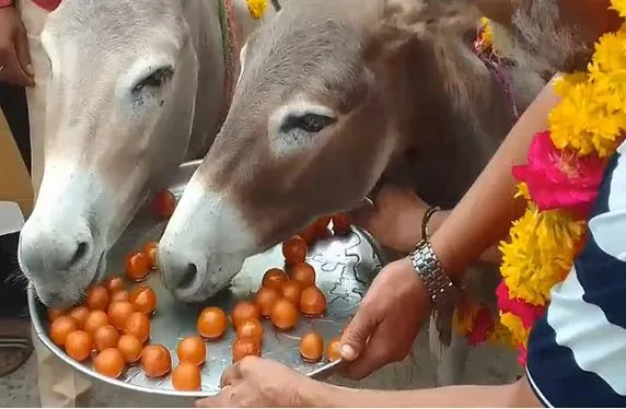 राजस्थानची राजधानी जयपूर येथे नुकतेच एक प्रदर्शन पार पडले आहे. या प्रदर्शनात गाढवे आणण्यात आली आणि प्रदर्शन पाहण्यासाठी आलेल्या लोकांनी या गाढवांना येथेच्छ गुलाबजाम खाऊ घातल्याचे दिसून आले आहे. हे प्रदर्शन शहरातील इतिहासप्रसिद्ध चांदपोल हनुमान मंदिराच्या परिसरात आयोजित करण्यात आले होते. प्रथम प्रदर्शनाच्या आयोजकांनी गर्दभांना गुलाबजाम दिले. ते पाहून प्रदर्शनासाठी जमलेल्या लोकांनीही त्यांना गुलाबजाम चारण्यास प्रारंभ केला. अशा प्रकारे सर्व गर्दभ ही मिठाई पोटभर खाऊन तृप्त झाल्याचे दिसून आले.