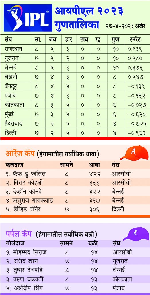 राजस्थान रॉयल्स 20 षटकांत 5 बाद 202 : जैस्वाल 43 चेंडूत 8 चौकार, 4 षटकारांसह 77, बटलर 21 चेंडूत 27, सॅमसन 17 चेंडूत 17, हेटमायर 8, ध्रुव जुरेल 15 चेंडूत 3 चौकार, 2 षटकारांसह 34, पडिक्कल 13 चेंडूत नाबाद 27, अश्विन नाबाद 1, अवांतर 11. गोलंदाजी : तुषार देशपांडे 2-42, थीक्षणा 1-24, जडेजा 1-32.