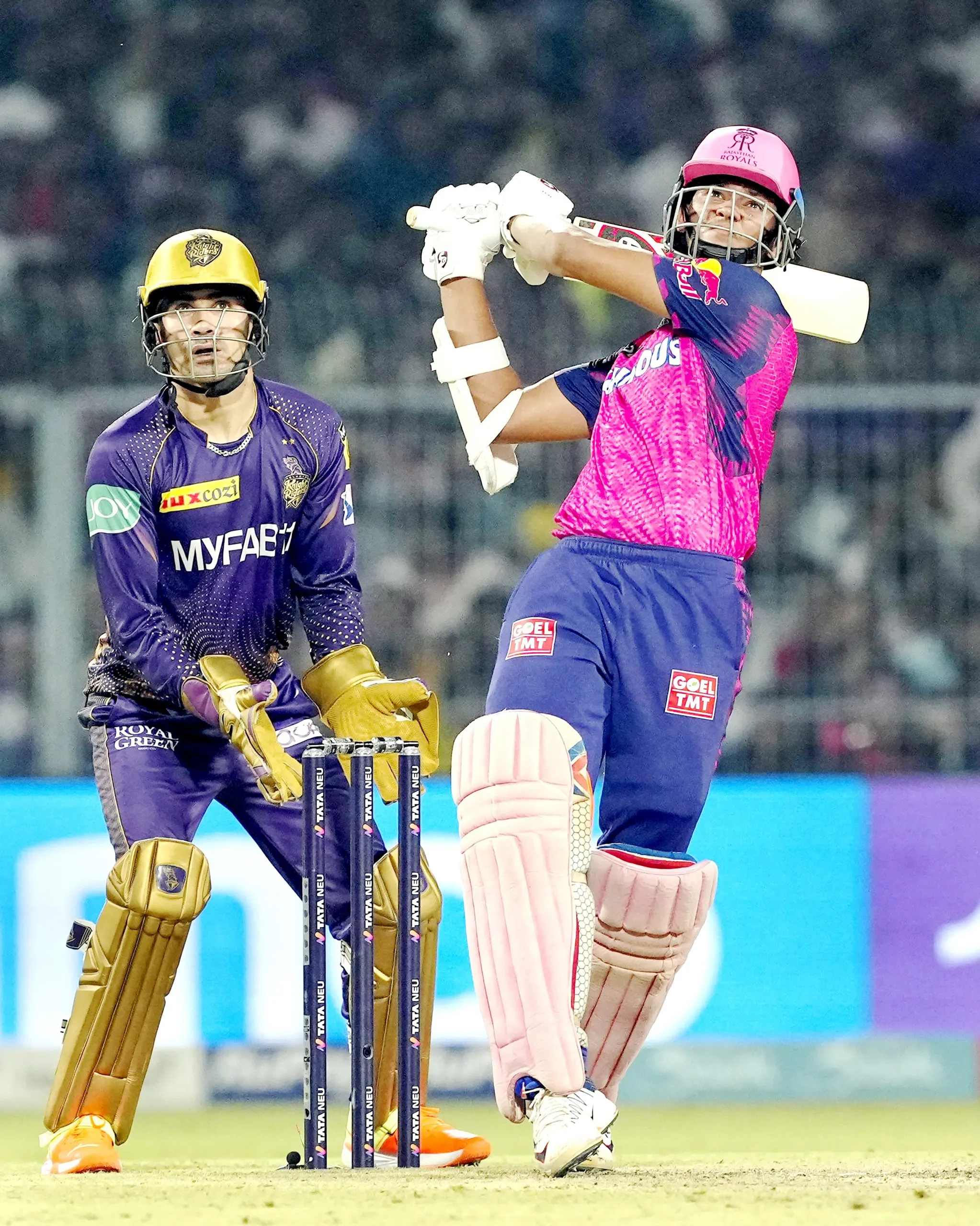 गुरुवारी येथील ईडन गार्डन्सवर खेळविण्यात आलेल्या आयपीएलमधील 56 व्या सामन्यात यशस्वी जैस्वाल आणि कर्णधार संजू सॅमसन यांच्या तुफानी फटकेबाजीच्या वादळासमोर कोलकाता नाईट रायडर्स भुईसपाट झाले. राजस्थान रॉयल्सने हा सामना 41 चेंडू बाकी ठेवून 9 गड्यांनी दणदणीत जिंकला. या विजयामुळे राजस्थान रॉयल्सने स्पर्धेच्या गुणतक्त्यात 12 सामन्यातून 12 गुणासह तिसरे स्थान घेतले असून कोलकाता नाईट रायडर्स 10 गुणासह सातव्या स्थानावर आहे. जैस्वालने 47 चेंडूत नाबाद 98 धावांची खेळी करताना आयपीएलमधील सर्वात वेगवान अर्धशतक केवळ 13 चेंडूत पूर्ण करण्याचा विक्रम नोंदवला. त्याने केएल राहुलचा 14 चेंडूत अर्धशतक नोंदवण्याचा विक्रम मागे टाकला. तसेच यजुवेंद्र चहल हा आयपीएलमध्ये सर्वाधिक बळी मिळविणारा गोलंदाज ठरला आहे. त्याचे आता 187 बळी झाले आहेत.