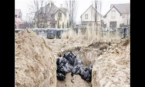कीव्ह क्षेत्रात 900 मृतदेहांसह आणखीन एका सामूहिक दफनभूमीचा शोध लावण्यात आल्याची घोषणा युक्रेनचे अध्यक्ष वोल्दोमिर झेलेंस्की यांनी केली आहे. पोलंडच्या प्रसारमाध्यमाला दिलेल्या मुलाखतीत झेलेंस्की यांनी मार्च महिन्यात रशियाच्या सैन्याने ज्या क्षेत्रात कब्जा केला होता, तेथेच ही सामूहिक दफनभूमी आढळून आल्याचे म्हणत नेमके किती लोक मारले गेले आहेत हे कुणीच जाणत नसल्याचे नमूद केले आहे.