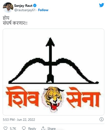 उद्धव ठाकरे बुधवारी राजीनामा देतील अशा चर्चा असतानाच मुख्यमंत्र्यांनी महाराष्ट्रासाठी तसेच ‘हिंदुत्वा’साठी जोरदार लढा देण्यासाठी कार्यकर्त्यांना साद घातली. त्यानंतर आज संजय राउत यांनी ‘होय, संघर्ष करणार’ अशा आशयाचे ट्वीट केले. महाराष्ट्राचे मुख्यमंत्री उद्धव ठाकरे यांच्या भाषणानंतर लगेच त्यांनी हे ट्विट आपल्या ट्विटर हँडलवरून केले आहे. आपल्या या संदेशाबोबर त्यांनी शिवसेनेच्या चिन्ह धनुष्यबाणाचे चित्र टाकले आहे.