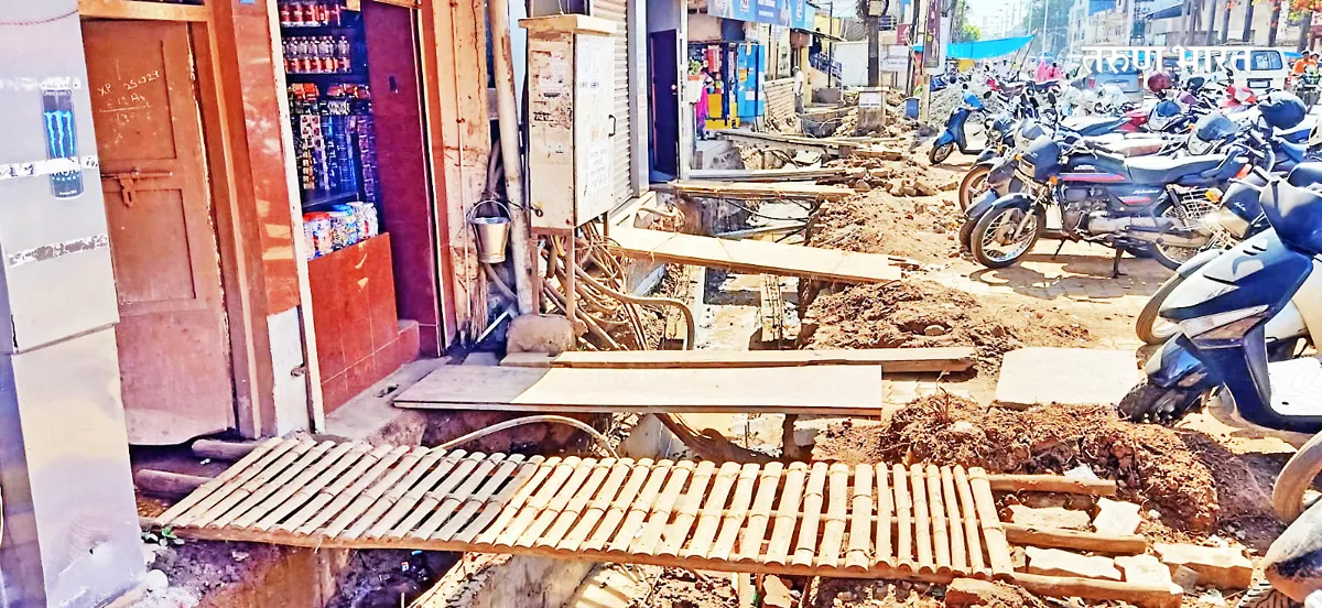 व्यावसायिक, वाहनधारक, रहिवाशांचे हाल : गटारीचे बांधकाम करून रस्ता त्वरित खुला करण्याची मागणी