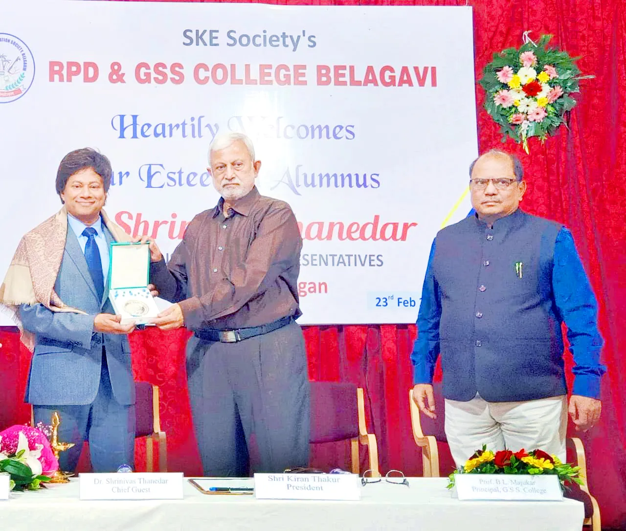 किरण ठाकुर यांनी एसकेईतर्फे व लोकमान्य सोसायटीतर्फे त्यांचा सत्कार केला. श्रीनिवास ठाणेदार यांनी साधेपणा जपला आहे, असे त्यांनी सांगितले. बेळगावसाठी आपण काय करू शकतो? या ठाणेदार यांच्या प्रश्नावर अमेरिकेतील एका दर्जेदार विद्यापीठाशी एसकेई सोसायटी सलग्न करा, अशी अपेक्षा किरण ठाकुर यांनी व्यक्त केली. प्राचार्या अनुजा नाईक यांनी परिचय करून दिला. प्रा. संदीप देशपांडे यांनी आभार मानले.