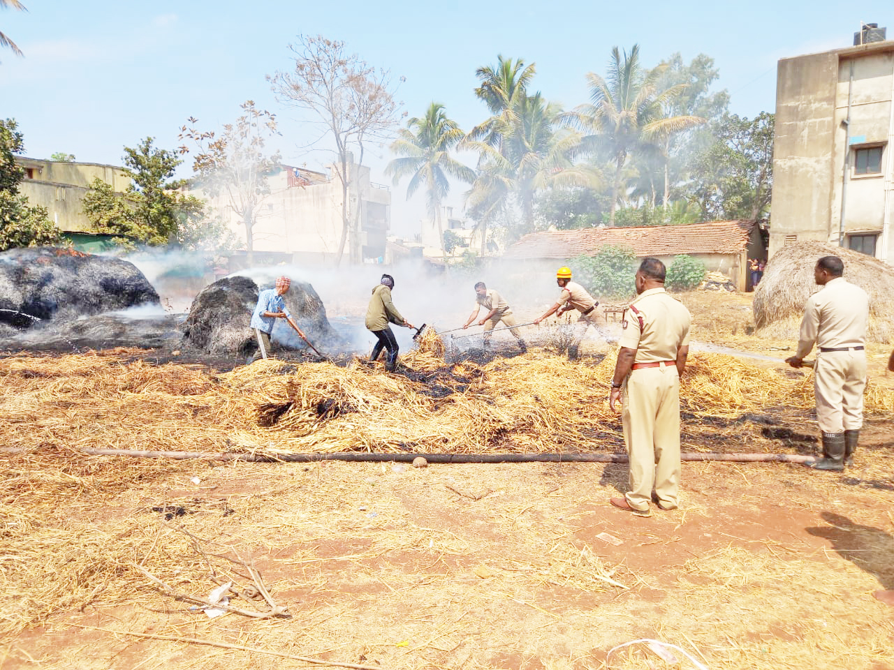 येथील श्री विठ्ठल रखुमाई मंदिर समोरील पाटील बंधूंच्या खुल्या जागेत असलेल्या सहा गवत गंजींना सोमवारी दुपारी 2 वाजता अचानक आग लागून 75 हजार रुपयांचे नुकसान झाले आहे. आगीचे नेमके कारण समजू शकले नाही. मात्र गवत जळून खाक झाल्यामुळे जनावरांना काय घालावे, असा प्रश्न शेतकऱ्यांना पडला आहे. पाटील बंधूंच्या खुल्या जागेमध्ये चेतन मल्लाप्पा चव्हाण, प्रसाद शिवाजी चव्हाण, संजय तम्मान्ना पाटील यांचे प्रत्येकी एक ट्रॉली पिंजर तर गणपत गोविंद निलजकर, बाळू परशराम अष्टेकर, परशराम गुंडू पाटील यांचे प्रत्येकी 2 ट्रॉली पिंजर ठेवले होते. सोमवारी भरदुपारी या गवत गंजींना आग लागली. आग आटोक्यात आणण्यासाठी अग्निशमन दलाच्या गाडीला कळविले. अग्निशमनचे जवान तातडीने दाखल होऊन आग आटोक्यात आणली. गवत गंज्यांच्या आजूबाजूला नागरी वस्ती आहे. यामुळे नागरिकांची आग आटोक्यात आणण्यासाठी एकच धावपळ उडाली. यावेळी राजू चव्हाण या सामाजिक कार्यकर्त्यांने अग्निशमनला फोनवरून कळविल्यानंतर लगेच गाडी आली व पाण्याच्या माऱ्याने आग आटोक्यात आणली. शेतकऱ्यांना नुकसानभरपाई मंजूर करून दिलासा देण्याची मागणी करण्यात येत आहे. तलाठी यांचे सहाय्यक बाळू पाटील यांनी घटनेचा पंचनामा केला. घटनास्थळी ग्रा. पं. सदस्य जयराम पाटील, तानाजी पाटील, वंदना चव्हाण, नवनाथ पुजारी, सद्दाप्पा राजकट्टी आदी उपस्थित होते.