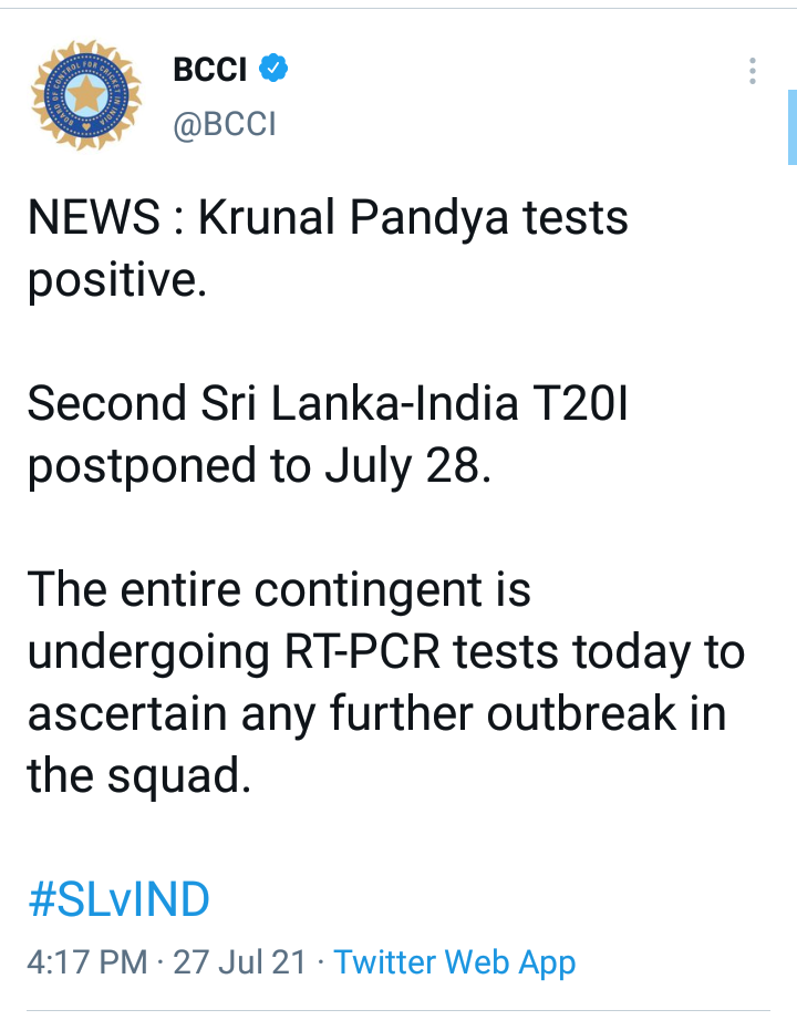 बीसीसीआयकडून जारी करण्यात आलेल्या निवेदनात सांगण्यात आले आहे की, क्रुणाल पांड्या कोरोना संक्रमित आढळल्याने आज होणारी मॅच एक दिवस म्हणजेच 28 जुलैपर्यंत स्थगित करण्यात आली आहे. तसेच त्यांच्या संपर्कात आलेल्या खेळाडूंचे रिपोर्ट निगेटीव्ह आल्यानंतरच बुधवारी दुसरा सामना खेळवला जाणार आहे.