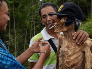 धूम्रपान, अर्थात सिगरेट किंवा बिडी ओढणे कोणत्याही जिवंत व्यक्तीच्या आरोग्याला वैद्यकशास्त्राच्या दृष्टीने घातक आहे. म्हणून सिगरेटच्या पाकिटावर तसा वैधानिक इशारा छापलेला असतो. तथापि, इंडोनेशिया या देशातील एका जमातीत एक अनोखी प्रथा आहे. या जमातीतील व्यक्ती मृत झाली, की तिचे दफन करण्यात येते. काही काळानंतर तिचे थडगे उकरले जाते. त्यातून अस्थिपंजर झालेला त्या व्यक्तीचा मृतदेह बाहेर काढण्यात येतो. मृतदेहाला नवी कोरी वेषभूषा चढविली जाते आणि त्याच्या तोंडात पेटती सिगरेट ठेवली जाते. म्हणजेच त्याच्याकडून धूम्रपान करवून घेतले जाते. आपल्या मृत पावलेल्या प्रियजनांचे स्मरण करण्याची या जमातीची ही अशी रीत आहे.