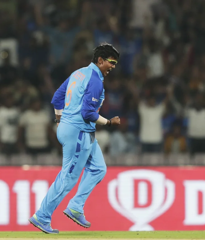 भारत : 20 षटकात 4 बाद 109 (मानधना 0, रॉड्रिग्ज 11, देओल 46, हरमनप्रित कौर 21, दीप्ती शर्मा नाबाद 16, वस्त्रकार नाबाद 1, अवांतर 14, मलाबा 2-16, खाका 1-17, लूस 1-22), दक्षिण आफ्रिका : 18 षटकात 5 बाद 113 (वुलव्हर्ट 0, ब्रिट्स 8, गुडॉल 7, लूस 12, ट्रायॉन नाबाद 57, डर्कसन 8, डी क्लर्क नाबाद 17, अवांतर 4, स्नेह राणा 2-21, दीप्ती शर्मा 1-19, गायकवाड 1-25, रेणुकासिंग 1-16).