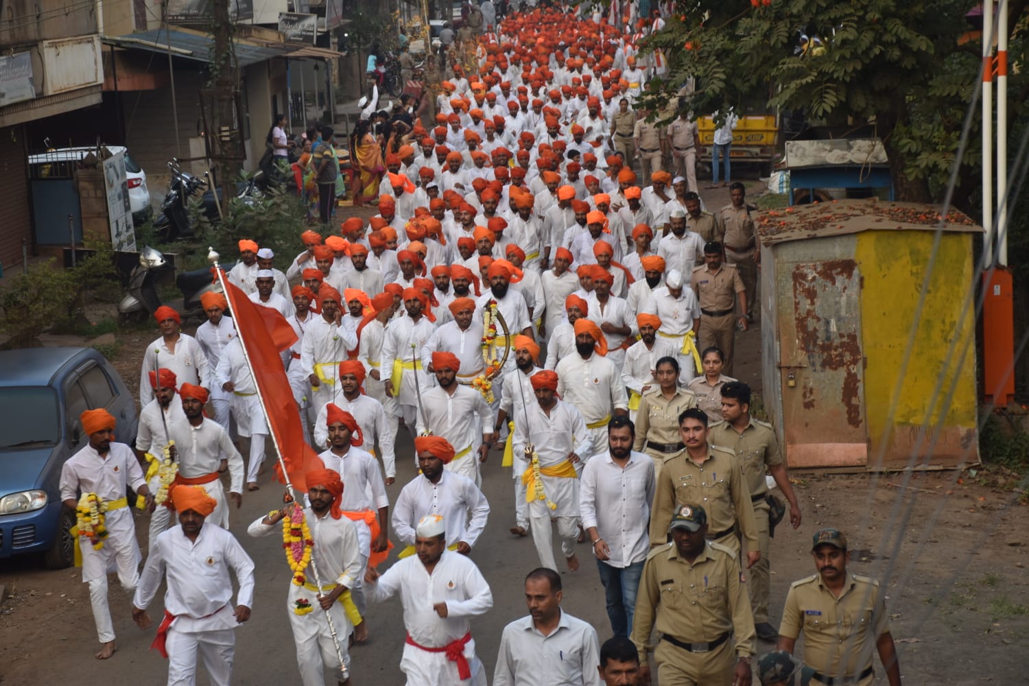 बेळगाव : नवरात्रीच्या काळात गल्लोगल्ली चैतन्यपूर्ण वातावरण निर्माण करणाऱ्या दुर्गामाता दौडला रविवारपासून प्रारंभ झाला. यावर्षी दुर्गामाता दौडचे रौप्यमहोत्सवी वर्ष असल्याने जल्लोषपूर्ण वातावरणात दौडला सुरुवात झाली. रविवारी साप्ताहिक सुटी असल्याने हजारोंच्या संख्येने शिवभक्त दौडमध्ये सहभागी होऊन भवानी माता, दुर्गादेवीचा जागर करीत होते. पहाटेच्या धुक्यामध्ये भल्यामोठ्या रांगोळ्यामधून काढण्यात आलेली दौड अस्मरणीय ठरली. शिवप्रतिष्ठान हिंदुस्थान बेळगावच्यावतीने प्रतिवर्षाप्रमाणे यावर्षी दुर्गामाता दौडचे आयोजन करण्यात आले आहे. रौप्यमहोत्सवी वर्षातील दौडला रविवारी छत्रपती शिवाजी उद्यान येथून प्रारंभ झाला. पहाटे पाच वाजल्यापासून शिवभक्त तयारीला लागले होते. छत्रपती शिवाजी महाराजांच्या मूर्तीचे विधिवत पूजन करण्यात आले. प्रेरणा मंत्र म्हणून आरती म्हणण्यात आली. शेकडो शिवभक्तांनी फेटा बांधण्यासाठी उद्यान परिसरात गर्दी केली होती. प्रतिवर्षाप्रमाणे छत्रे गुरुजी व त्यांच्या सहकाऱ्यांच्या हस्ते शिवरायांच्या मूर्तीचे पूजन करून ध्वज चढविण्यात आला. कर्नाटक प्रांत प्रमुख किरण गावडे यांनी शिवभक्तांना दौडच्या शिस्तीबाबत मार्गदर्शन केले. दौडच्या मार्गावर फुलांचा वर्षाव केला जात होता. रात्रभर जागून शिवभक्तांनी देखावे, फुलांची आरास, रांगोळ्या, भगव्या पताका लावून परिसराला एक मंगलमय रुप दिले होते. शास्त्रीनगर, महाद्वार रोड, समर्थनगर, मार्गे कपिलेश्वर मंदिरामध्ये दौडची सांगता झाली. आरती व ध्येयमंत्र झाल्यानंतर जिल्हा प्रमुख विश्वनाथ पाटील, शहरप्रमुख अनंत चौगुले, तालुका प्रमुख परशुराम कोकितकर यांच्या हस्ते ध्वज उतरविण्यात आला.