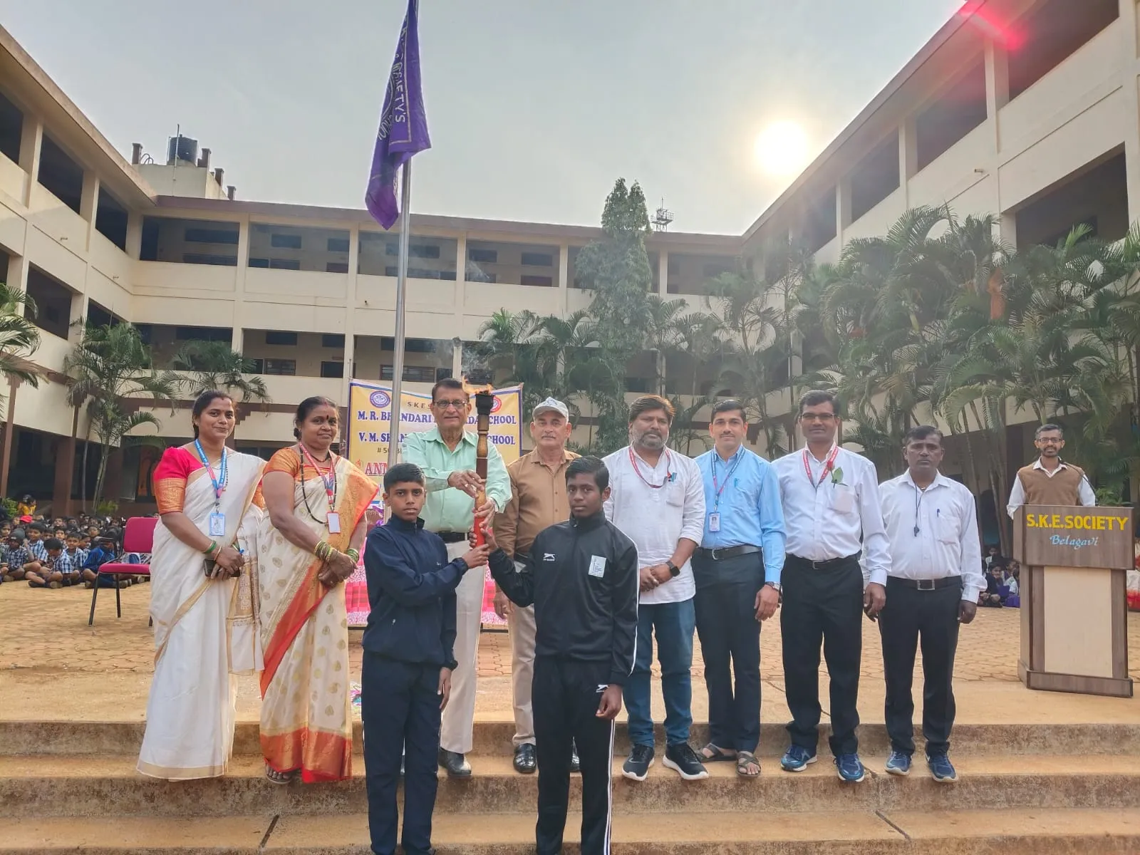 बेळगाव : एसकेई सोसायटी संचलित व्ही. एम. शानभाग मराठी शाळा आणि एम. आर. भंडारी कन्नड शाळा यांच्या वार्षिक क्रीडा स्पर्धांना उत्साहात प्रारंभ झाला. प्रमुख पाहुणे म्हणून ठळकवाडी हायस्कूलचे क्रीडा शिक्षक विवेक पाटील तर अध्यक्षस्थानी सोसायटीच्या स्पोर्ट्स अॅकॅडमीचे चेअरमन आनंद सराफ होते. मान्यवरांच्याहस्ते क्रीडा ध्वजारोहण झाले. विद्यार्थ्यांनी पथसंचलनाद्वारे पाहुण्यांना मानवंदना दिली. विवेक पाटील यांचा परिचय टी. सी. पाटील यांनी तर आनंद सराफ यांचा परिचय उषा शानभाग यांनी करुन दिला. संगीता देशपांडे व उषा शानभाग यांच्या हस्ते पाहुण्यांचे पुष्पगुच्छ देवून स्वागत करण्यात आले. मुख्याध्यापकांचे स्वागत विद्यार्थिनी संस्कृती निकमने पुष्प देवून केले. एम. व्ही. शानभाग शाळेचा विद्यार्थी सोहम बसुर्तेकर व एम. आर. भंडारी शाळेचा विद्यार्थी प्रवीण जुट्टपण्णावर यांनी क्रीडाज्योत पाहुण्याहंकडे सुपूर्द केली.