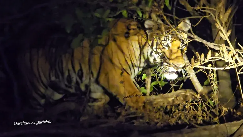या सफरीत स्वप्नीलला ‘महाधनेश’ दिसला. थोडा उंचच बसला होता. त्याचे फोटो घेऊन आम्ही पुढे निघालो. वाटेत ‘मलबार ग्रे’ दिसला. फिरता फिरता सायंकाळ झाली. सगळीकडे अंधार पसरला होता. रस्त्यावर शुकशुकाट होता. वाहनाच्या उजेडात काळा रस्ता तेवढा दिसत होता. अचानक दोडामार्ग जंगलात संजयला कुणाचे तरी डोळे चमकताना दिसले. एक गायीच्या आकाराएवढा प्राणी जंगलातून येत रस्त्यावर चालताना दिसला. काळोख असल्याने नीट दिसत नव्हते. अक्षय म्हणाला, ‘गाय काय रे ती?’ स्वप्निल ओरडला, ‘अरे वाघ! पट्टेरी वाघ’. सगळे सावध झाले. गाडी येत आहे हे बघून वाघ उडी मारून रस्त्याच्या कडेला गेला व तिथेच थांबला. रस्त्याची कडा रस्त्यापेक्षा थोडी उंच होती. सगळ्यांच्या छातीची धडधड वाढली होती. कारण अवघ्या 10 ते 15 फुटावर वाघ होता. सगळ्यांची नजर वाघावर होती. अंग घामाने डबडबले होते. दर्शन एका बाजूला वळून त्याचा व्हीडिओ शूट करीत होता. वाघ मात्र आपल्याच नादात होता. जीव मुठीत घेऊन चौघे बंद गाडीत होतो, असेही दर्शन म्हणाला.