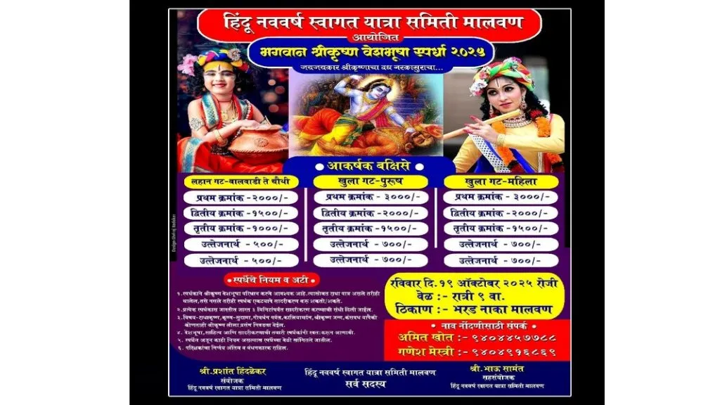 जयजयकार श्रीकृष्णाचा, वध नरकासुराचा हे ब्रीद घेऊन या स्पर्धेचे यावर्षी प्रथमच आयोजन करण्यात आले आहे. स्पर्धा तीन गटात होत आहे. यात लहान गट – बालवाडी ते चौथी- अनुक्रमे २०००, १५००, १००० रुपये, उत्तेजनार्थ दोन- ५०० रुपये, खुला गट – पुरुष- अनुक्रमे- ३०००, २०००, १५०० रुपये, उत्तेजनार्थ दोन- १००० रुपये, खुला गट – महिला- अनुक्रमे- ३०००, २०००, १५०० रुपये, उत्तेजनार्थ दोन- १००० रुपये पारितोषिक दिले जाणार आहे. स्पर्धकांना श्रीकृष्ण-वेशभूषा परिधान करणे आवश्यक आहे. त्यासोबत राधा पात्र असले तरीही चालेल. तसे नसले तरीही स्पर्धक एकट्याने सादरीकरण करू शकतो. वेशभूषा, साहित्य आणि सादरीकरणाची तयारी स्पर्धकांनी स्वतःहून करायची आहे. स्पर्धेत अजून काही नियम असल्यास स्पर्धेच्या ठिकाणी ते सांगण्यात येतील. परिक्षकांचा निर्णय अंतिम व बंधनकारक राहील. स्पर्धेत मालवण सह जिल्ह्यातून उत्स्फूर्त पणे नाव नोंदणी होत आहे. नाव नोंदणी व अधिक माहितीसाठी अमित खोत- ९४०४४५७७८८ किंवा गणेश मेस्त्री ९४०४९१६८६९ यांच्याशी संपर्क साधावा. स्पर्धेत जास्तीत जास्त स्पर्धकांनी सहभागी व्हावे. असे आवाहन हिंदू नववर्ष स्वागत यात्रा समितीच्या वतीने करण्यात आले आहे.