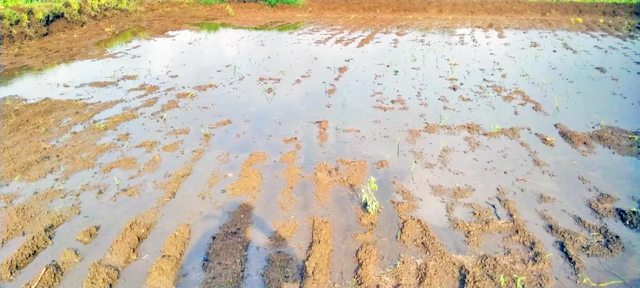 पश्चिम भागात अधिक पाऊस झाल्यामुळे शिवारत मोठ्या प्रमाणात पाणी साचले आहे. त्यामुळे शेतकऱ्यांनी पेरणी केलेल्या भातात पाणी साचल्याने भात पिकाचे नुकसान झाले आहे. काही शेतकऱ्यांनी दोन वेळा पेरणी केली आहे. शिवारात मोठ्या प्रमाणात पाणी साचून कोवळी भात पिके पाण्याखाली गेली आहेत. कर्ले, किणये, बहाद्दरवाडी, रणकुंडये, बामणवाडी, जानेवाडी, बिजगर्णी, बेळगुंदी, बेळवट्टी, सोनोली, यळेबैल, राकसकोप, इनाम बडस, बाकनुर भागातील शेतकऱ्यांनी तर दोन वेळा भातपेरणी केली. जमिनीतून भात पीक बाहेर येण्याच्या कालावधीतच इतका मोठा पाऊस झाल्यामुळे या भागातील शेतकरी हतबल झाला आहे