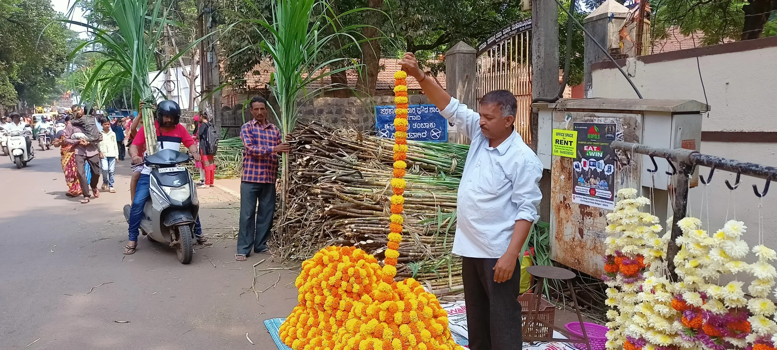 बेळगाव : खंडेनवमीच्या पार्श्वभूमीवर शहरात ऊस आणि झेंडूच्या फुलांची आवक वाढली आहे. मुख्य बाजारपेठेसह काकतीवेस रोड, यंदे खूट, सम्राट अशोक चौक यासह इतर ठिकाणी ऊस आणि झेंडूच्या फुलांची विक्री सुरू आहे. साधारण 70 रुपयांना पाच ऊस याप्रमाणे विक्री सुरू आहे. दसरा आणि दिवाळी सणांच्या पार्श्वभूमीवर शहरात मोठ्या प्रमाणात ऊस आणि झेंडूच्या फुलांची विक्री होते. सोमवारी खंडेनवमी असल्याने शहरात ऊस आणि झेंडूची फुले विक्रीसाठी दाखल झाली होती. ग्रामीण भागातील मुतगा, सांबरा आणि बाळेकुंद्री भागातून उसाची आवक झाली होती. खंडेनवमीला पारंपरिक पद्धतीने ऊस लावून शस्त्रांची पूजा केली जाते. त्यामुळे उसाला मोठ्या प्रमाणात मागणी असते. त्यामुळे बाजारात उसाची आवक वाढली आहे. पूजेसाठी नागरिकांकडून ऊस आणि झेंडूची फुले खरेदी केली जात आहेत. पूजेबरोबर घरोघरी आणि वाहनांनाही ऊस बांधले जातात. यासाठी उसाची खरेदी सुरू झाली आहे.