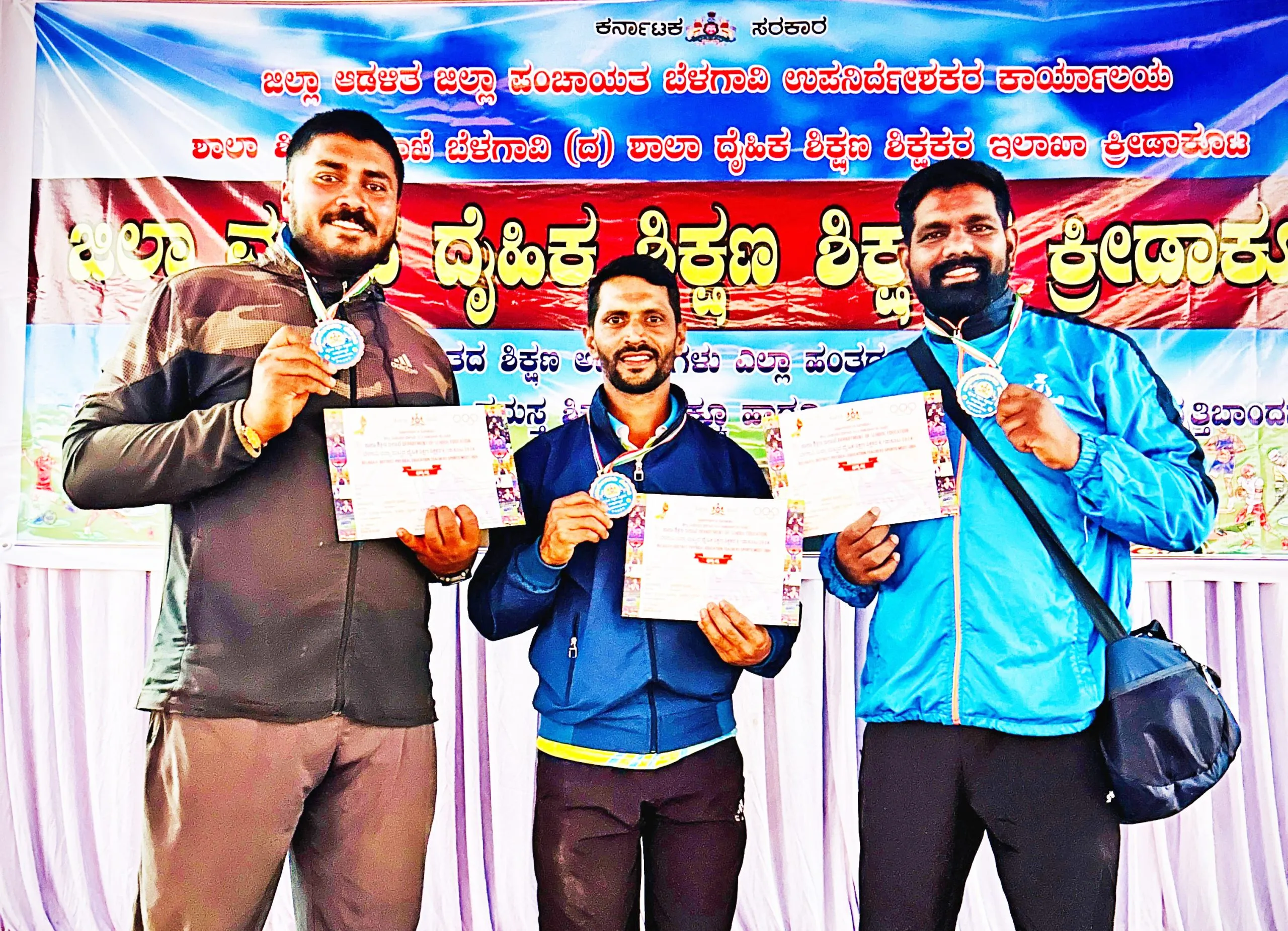 बेळगाव : सार्वजनिक शिक्षण खात्यातर्फे व बैलहोंगल शिक्षण खात्यातर्फे घेण्यात आलेल्या क्रीडा शिक्षकांच्या जिल्हास्तरीय अॅथलेटिक्स क्रीडा स्पर्धेत सुनील बेळगुंदकर, अनंत पाटील यांची राज्यस्तरीय स्पर्धेसाठी निवड झाली आहे.जिल्हा क्रीडांगण बेळगाव व बैलहोंगल तालुक्यातील केआरसीएस इंग्लिश मिडीयम शाळेच्या मैदानावरय् या स्पर्धा घेण्यात आल्या. या स्पर्धेमध्ये द.म.शि. मंडळ संचलित मंडोळी हायस्कूल मंडोळी शाळेचे क्रीडा शिक्षक सुनील बेळगुंदकर यांनी 200 मी. धावणे-द्वितीय, 400 मी. धावणे-द्वितीय, 4×100 मी. रिलेमध्ये प्रथम क्रमांक मिळविला. द.म.शि. मंडळ संचलित ज्योती हायस्कूल-कर्ले शाळेचे क्रीडा शिक्षक अनंत पाटील यांनी गोळाफेक, थाळीफेक व भालाफेकमध्ये प्रथम क्रमांक पटकाविला. या सर्व शिक्षकांची चिक्कमंगळूर येथे होणाऱ्या राज्यस्तरीय स्पर्धेसाठी निवड झाली. बेळगाव जिल्हा शारीरिक शिक्षण अधिकारी जुनेद पटेल, बेळगांव ग्रामीणच्या पीईओ साधना बद्री, खानापूर पीईओ सुरेखा मिरजी यांच्या हस्ते प्रमाणपत्र, पदके देवून त्यांचा सत्कार करण्यात आला.