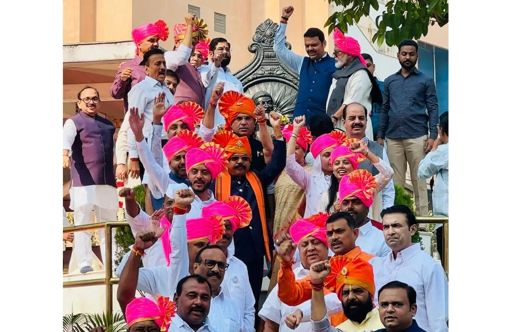 शपथविधी सोहळ्यासाठी भाजपचे आमदार विधानभवनात आधीच उपस्थित होते. राष्ट्रवादीचे आमदार फेटे बांधून अजित पवार यांच्या नेतफत्वाखाली दाखल झाले. मात्र विधान भवनाच्या पायऱ्यांवर उभे राहून मुख्यमंत्री देवेंद्र फडणवीस हे उपमुख्यमंत्री एकनाथ शिंदे यांची प्रतिक्षा करीत होते. शिवसेनेचे आमदार भगवे फेटे बांधून एकनाथ शिंदे यांच्या स्वागतासाठी विधानभवनाच्या द्वारावर उभे होते. एकनाथ शिंदे यांचे आगमन होताच फडणवीस, अजित पवार आणि एकनाथ शिंदे या तीन नेत्यांसह महायुतीच्या आमदारांनी छत्रपती शिवरायांच्या पुतळ्याला पुष्पमाला अर्पण केली. त्यानंतर शिवरायांच्या जयघोषात सर्वांनी विधान सभागफहात प्रवेश केला.