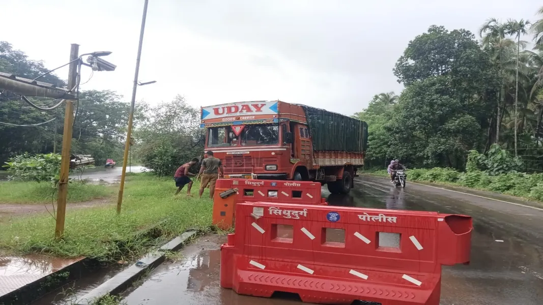 याबाबत अधिक माहिती अशी की, गोव्यातून मुंबईच्या दिशेने जाणारा ट्रक बांदा पोलिसांच्या इन्सुली तपासणी नाका आला असता अचानक गाडीच्या स्टेअरिंगचा रॉड तुटला. त्यामुळे स्टेअरिंग लॉक झाले आणि गाडी दुभाजकावर आदळली. तपासणी नाका येथे महामार्गावर बॅरिगेटस लावल्याने ट्रक चालकाने गाडीचा वेग कमी केल्याने मोठा अनर्थ टळला जर ट्रक वेगात असता किंवा त्या समोर अन्य कोणतेही वाहन असते तर त्या वाहनाला सोबत घेऊन ट्रक तपासणी नाक्यात घुसला असता आणि मोठी दुर्घटना घडली असती. मात्र सुदैवाने कोणतीही मोठी हानी झाली नाही. याबाबतची कोणतीही नोंद बांदा पोलीसात नव्हती.
