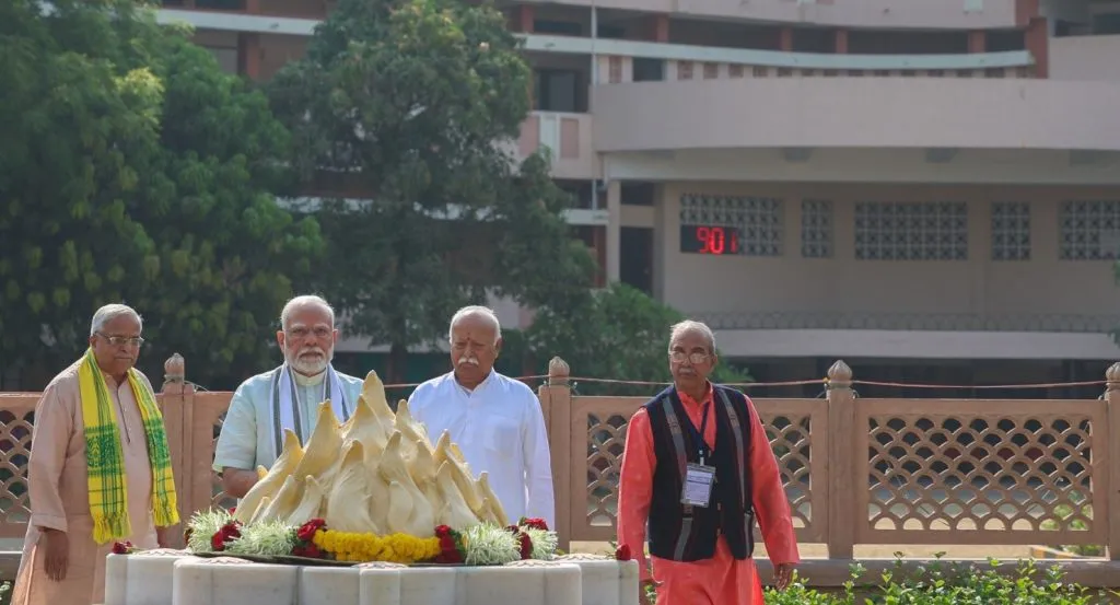 पंतप्रधान नरेंद्र मोदी यांनी रविवारी सकाळी राष्ट्रीय स्वयंसेवक संघाच्या रेशिमबाग येथील डॉ. हेडगेवार स्मफती मंदिर परिसराला भेट दिली. यावेळी त्यांनी आद्य सरसंघचालक डॉ. केशव बळीराम हेडगेवार तसेच द्वितीय सरसंघचालक गोळवलकर गुऊजी यांच्या समाधीस्थळाला अभिवादन केले. यावेळी सरसंघचालक डॉ. मोहन भागवत हेदेखील उपस्थित होते. पंतप्रधान झाल्यानंतर नरेंद्र मोदी यांनी पहिल्यांदाच संघ स्मफती मंदिराला भेट दिली आहे. संघ शताब्दी वर्षाच्या पार्श्वभूमीवर या भेटीचे महत्त्व आणखी वाढले.