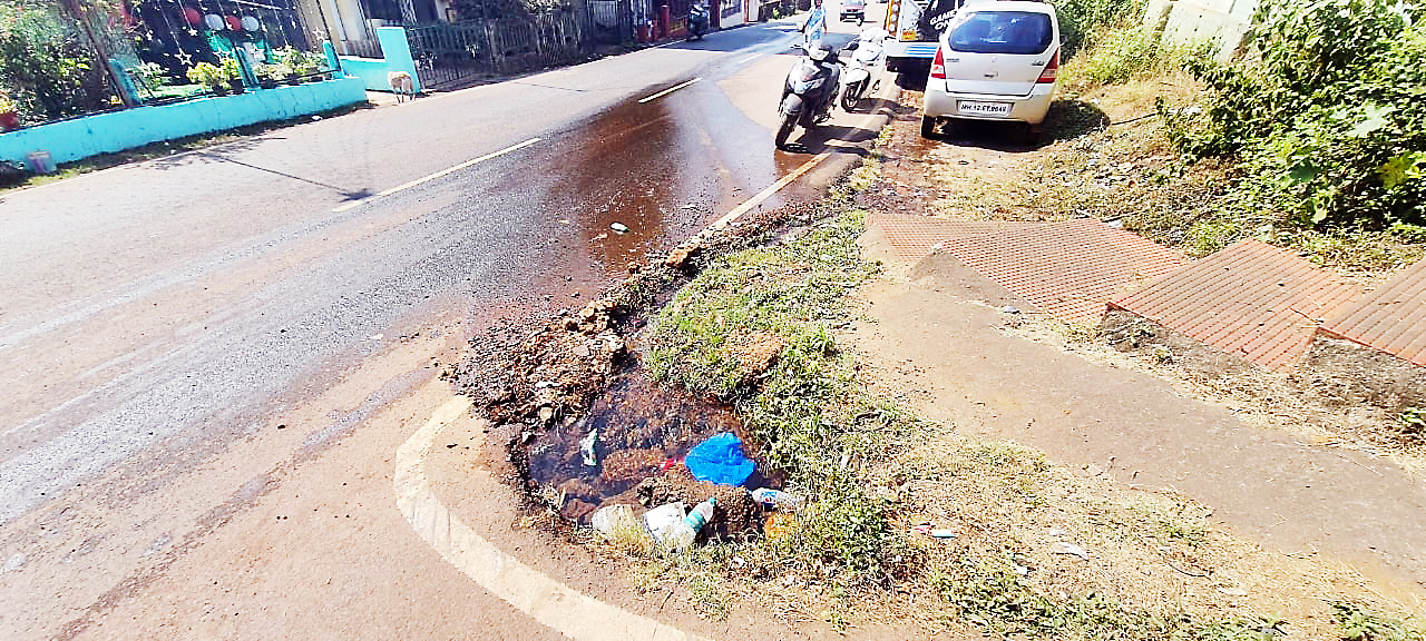 सदर जलवाहिनी त्याच ठिकाणी फुटून मोठ्या प्रमाणात पाणी रस्त्यावरून वाहत होते. त्यानंतर ती दुरूस्त करण्यात आली होती. परंतु मागील दिड महिन्याच्या काळात ती पुन्हा फूटली असल्याने ती दुरूस्त केलेल्या प्ल?बर्सनी केलेल्या कामावर प्रŽचिन्ह निर्माण झाले आहे. रविवारी (दि. 24) सदर जलवाहिनीला गळती लागलेल्या अवस्थेत ती वाहत आहे. सध्या त्यातून जास्त प्रमाणात पाणी वाहू लागले आहे. या रस्त्यावरून ये जा करणाऱ्या पादचारी व इतरांना सध्या याच पाण्यातून वाट काढावी लागत आहे. तसेच रस्त्यावरून भरधावपणे जाणाऱ्या वाहनांमुळे ते लोकांच्या अंगावरही शिंपडते. आतातरी या जलवाहिनीची योग्य पध्दतीने व योग्य प्ल?बर्सकडून दुरूस्ती करून घ्यावी, अशी मागणी होत आहे.