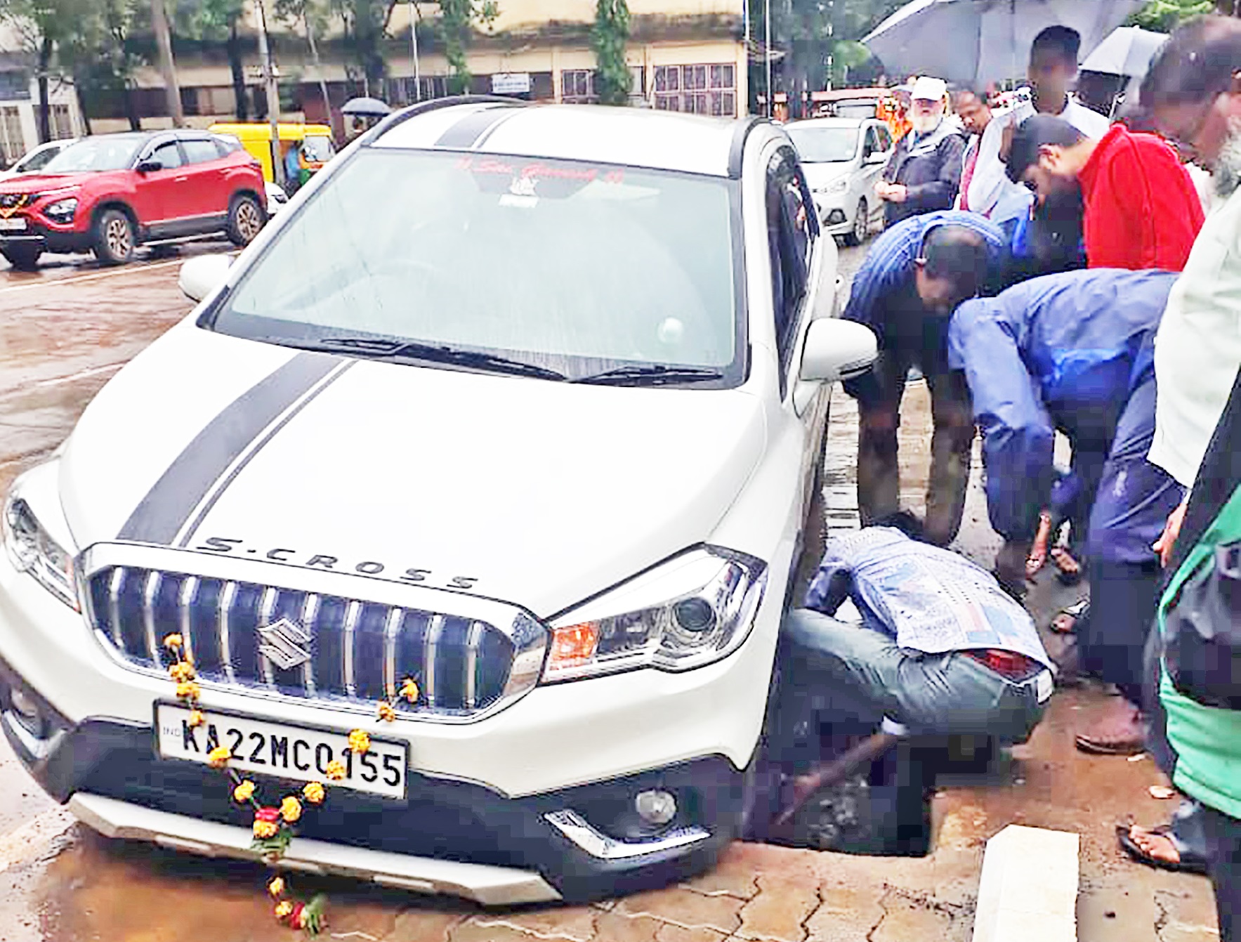 कार अडकून पडल्याने बघ्यांची एकच गर्दी झाली. यावेळी अडकलेली कार बाहेर काढण्यासाठी उपस्थित नागरिकांनी मदत केली. अशा घटना वारंवार घडत असल्याने उघड्या चेंबरवर झाकण घालण्याची मागणी वाहनधारकांतून केली जात आहे.