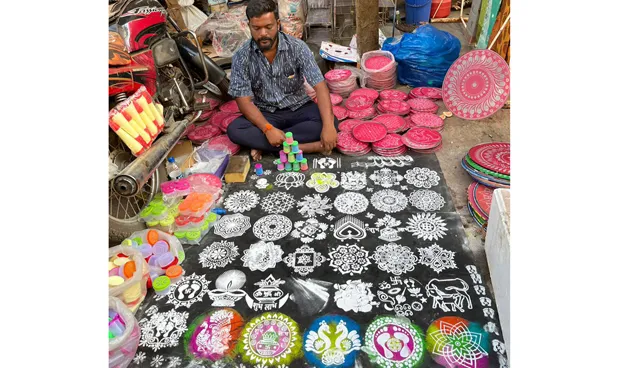 रांगोळी हे अभिव्यक्तीचेही साधन आहे. महिलांच्या कल्पकतेला रांगोळीमुळे वाव मिळाला आहे. दोन बोटांच्या चिमटीमध्ये रांगोळी घेऊन बारीक रेषेची रांगोळी काढणे हे खरे तर कौशल्याचे काम. मात्र, आज रांगोळीचे स्वरुप बदलले. आता रांगोळ्यांसाठी विविध माध्यमे आपल्यासमोर आहेत. रांगोळीचे स्टीकर्स हा त्यातलाच एक प्रकार. याशिवाय रांगोळीचे छाप, पेन, पाच भोके असलेला रांगोळीचा डबा, ज्यातून रांगोळी पुढे रेखाटत नेता येते. याशिवाय विविध देवदेवतांच्या शुभचिन्हांचे छापसुद्धा बाजारात पाहायला मिळतात.